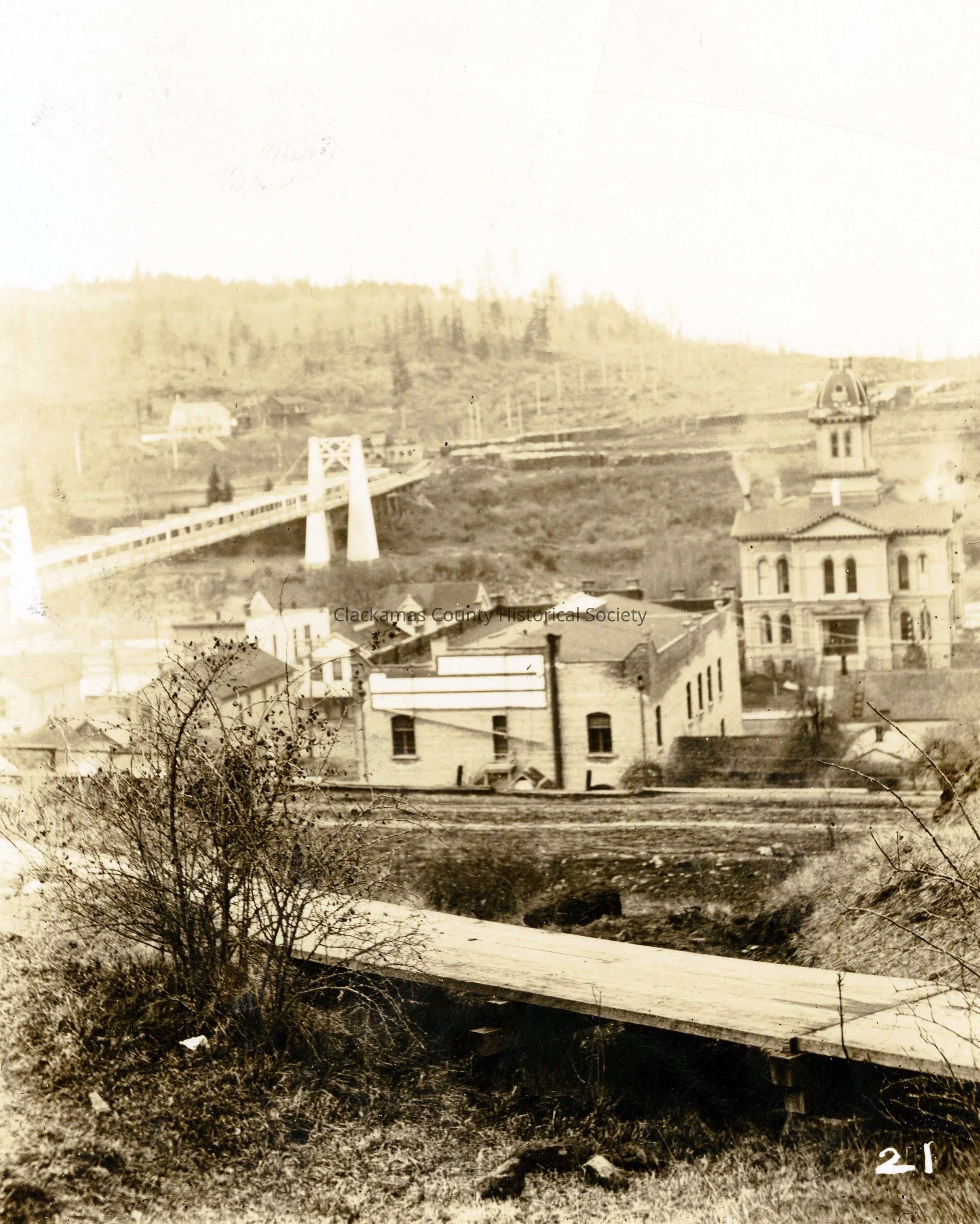 Clackamas County Courthouse and Suspension Bridge. View from Bluff at 9th Street.Made/Created