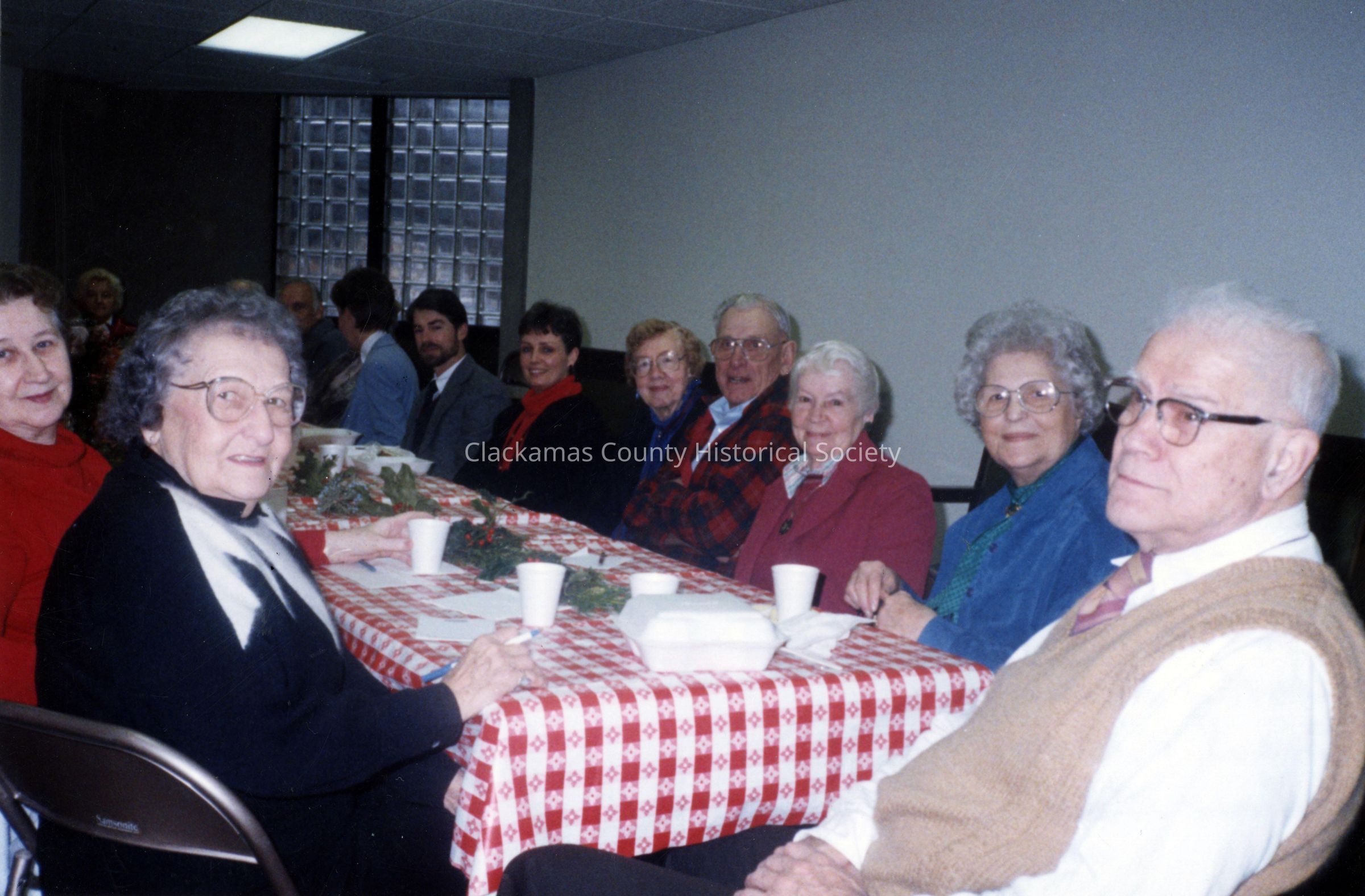 Clackamas County Historical Society Assessment Lunch. Photo 4. Large group at table. The two women on the far left, (L-R): 1) Genevieve Sullivan and 2) Alta Bluhm. The following people on the far right (R-L) are identified as 1) Wilmer Gardner; 2) Irene Leinert; 3) Dorothy Dunmire; 4) Oscar Larson; 5) Lorraine Barnett and 6) Jill Muller.Made/Created