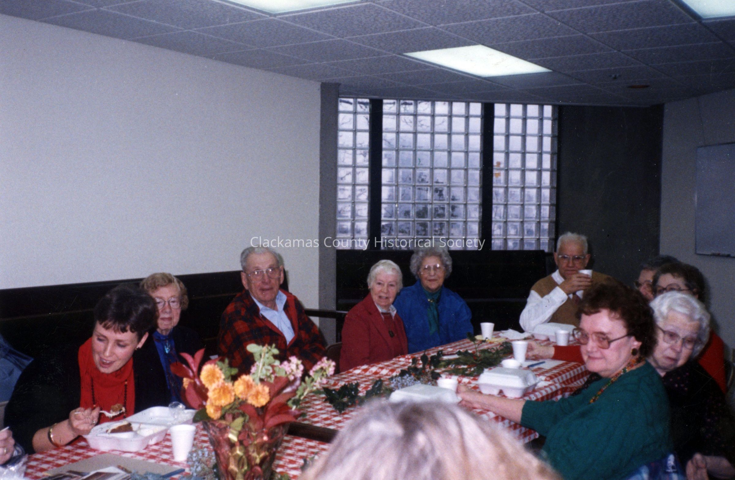 Clackamas County Historical Society Assessment Lunch. Photo 4. Large group at table. The from the far left, (L-R): 1) Jill Muller; 2) Lorraine Barnett; 3) Oscar Larsen; 4) Dorothy Dunmire; 5) Irene Leinert and 6) Wilmer Gardner. The three women on the far right are identified as (L-R): 1) Genevieve Sullivan; 2) Fern Heskett and 3) Helma Meier.