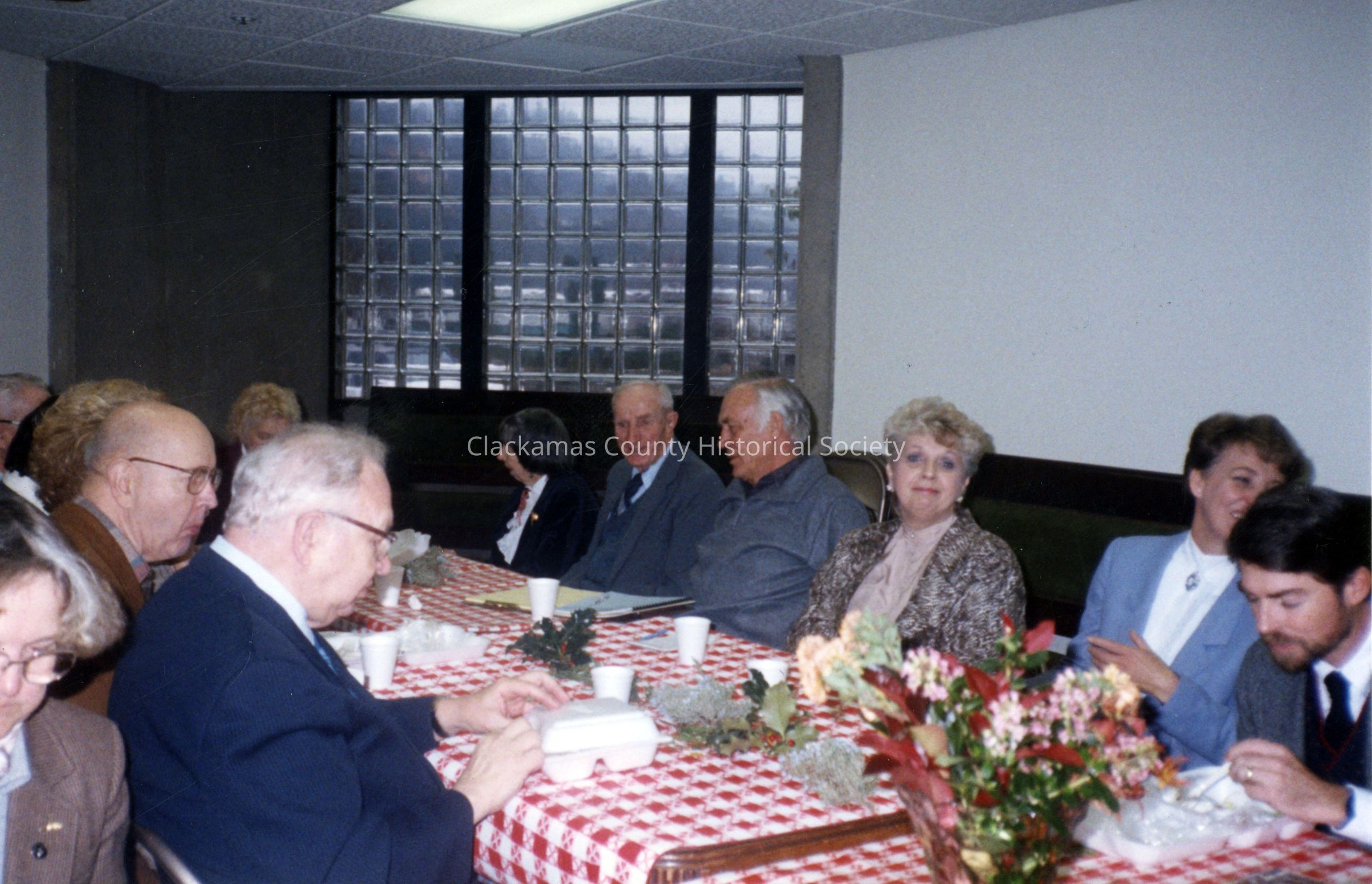 Clackamas County Historical Society Assessment Lunch. Photo 3. Large group at table. Only the three people on the far left are identified (L-R): 1) Margaret Kahl; 2) Frank Kahl; and 3) Bill Pyrch.