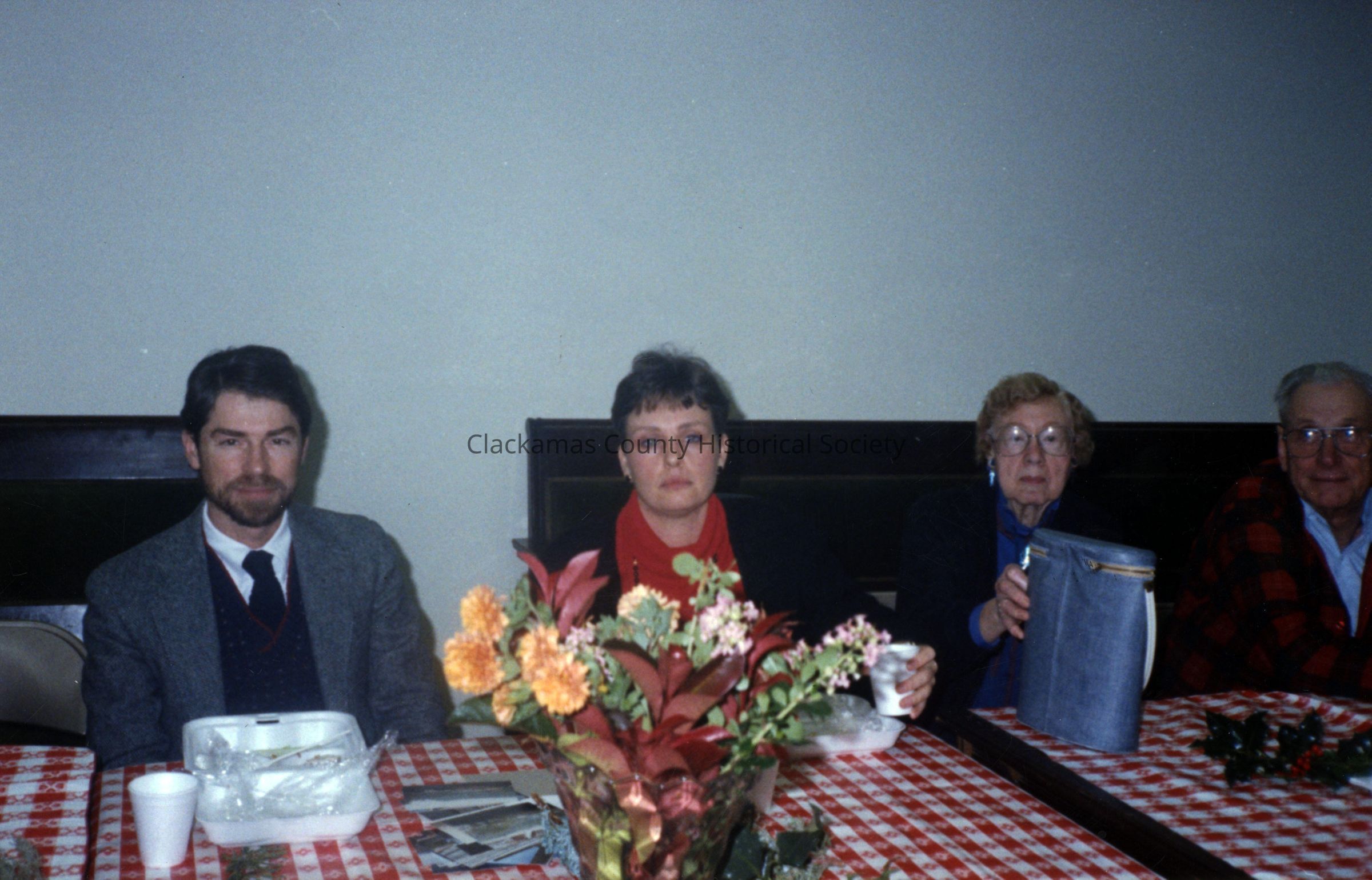 Clackamas County Historical Society Assessment Lunch. Person on far left is unidentified. Last three people right to left: A) Oscar Larsen; B) Lorraine Bennet; and C) Jill Muller.Made/Created