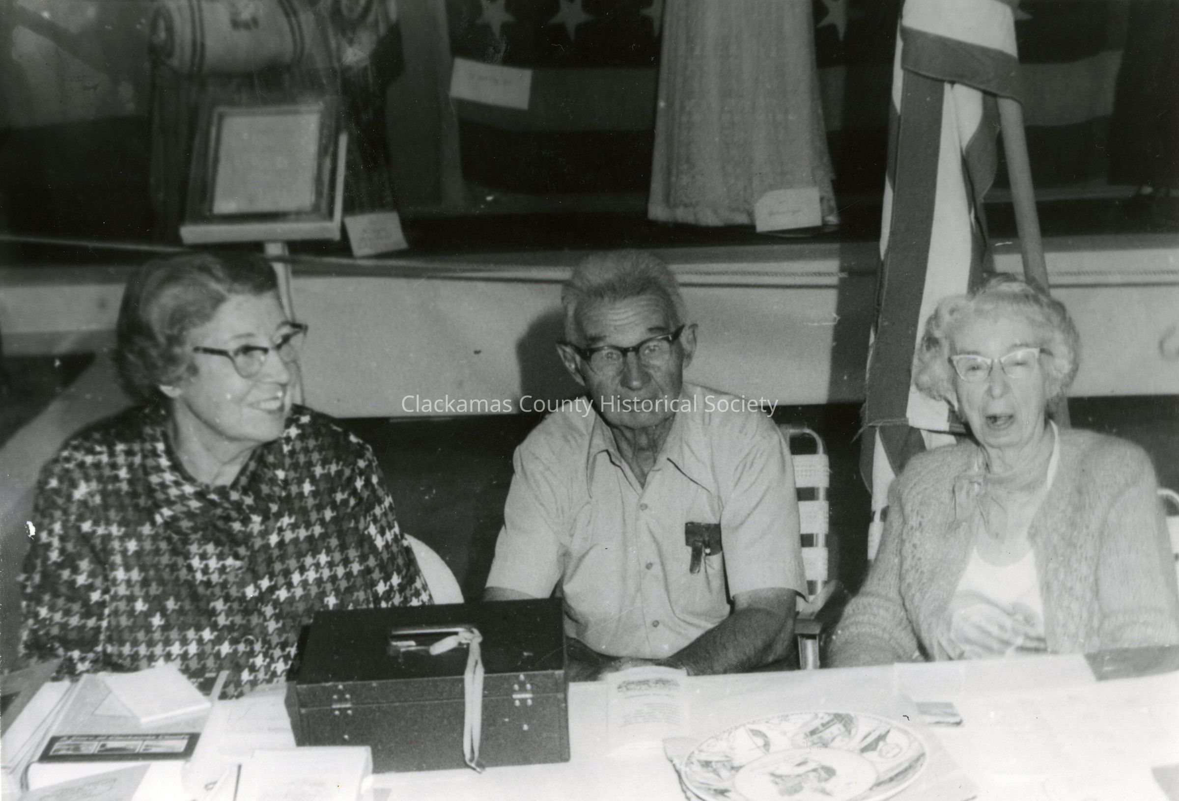 Clackamas County Historical Society Table at Clackamas County Fair. From L-R): 1) ? Neufer; 2) Henry Hurdt; and 3) Yoland Hurdt.Made/Created