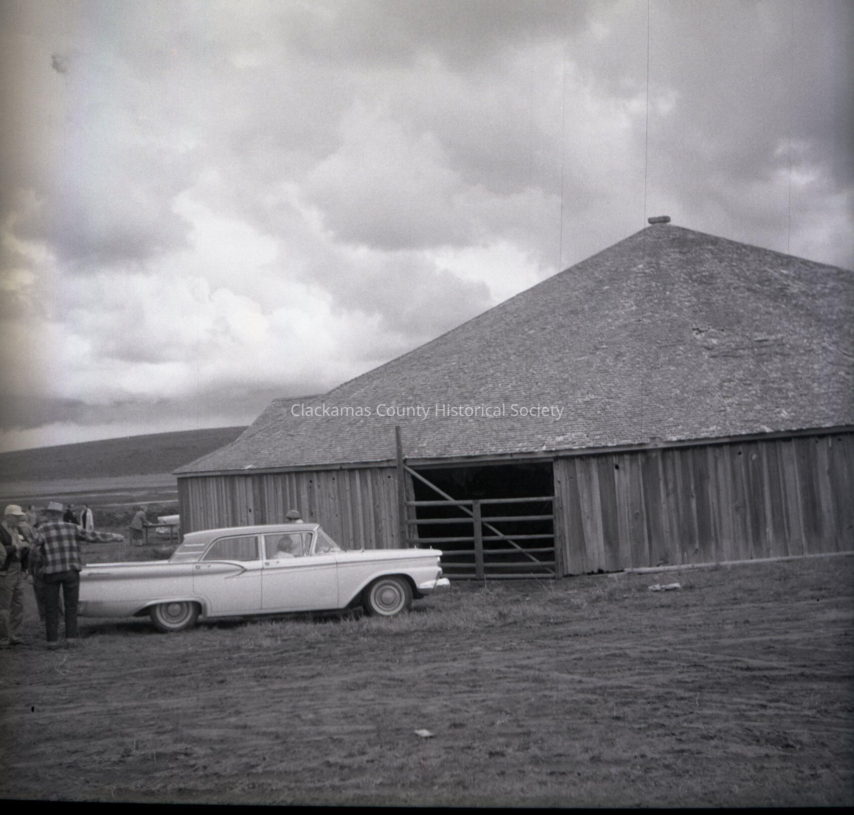Clackamas County Historical Society Trip to Harney County, #10. People and Ford vehicle in front of barn.Made/Created
