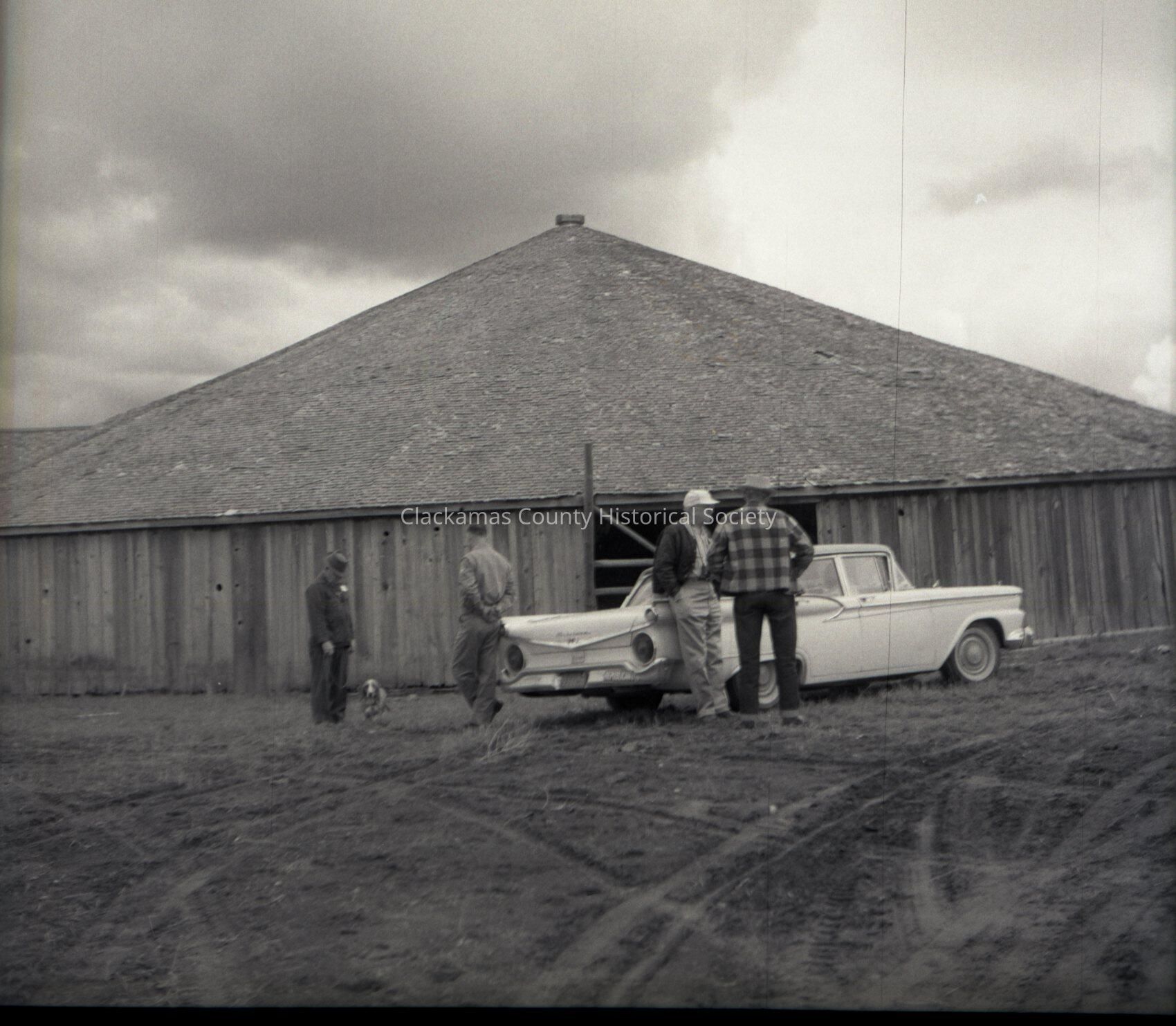 Clackamas County Historical Society Trip to Harney County, #2. People standing by Ford in front of barn.Made/Created