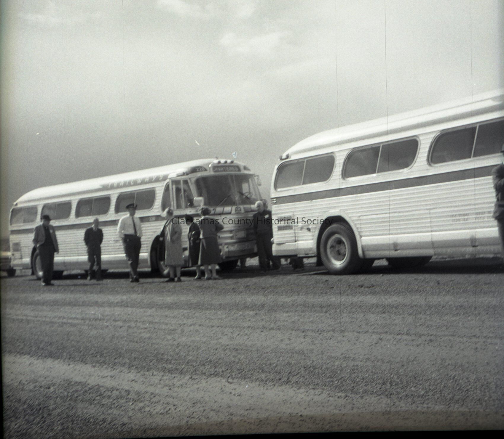 Clackamas County Historical Society Trip to Harney County, #4. People in front of two buses.Made/Created