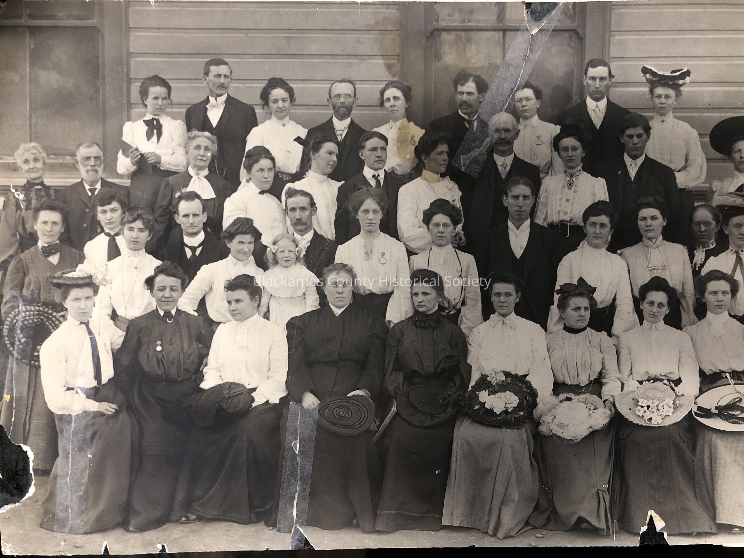 A lineup of mostly women, some men, outside of a building. Unidentified except for "Clackamas Dist. #64." Possibly Teachers?
