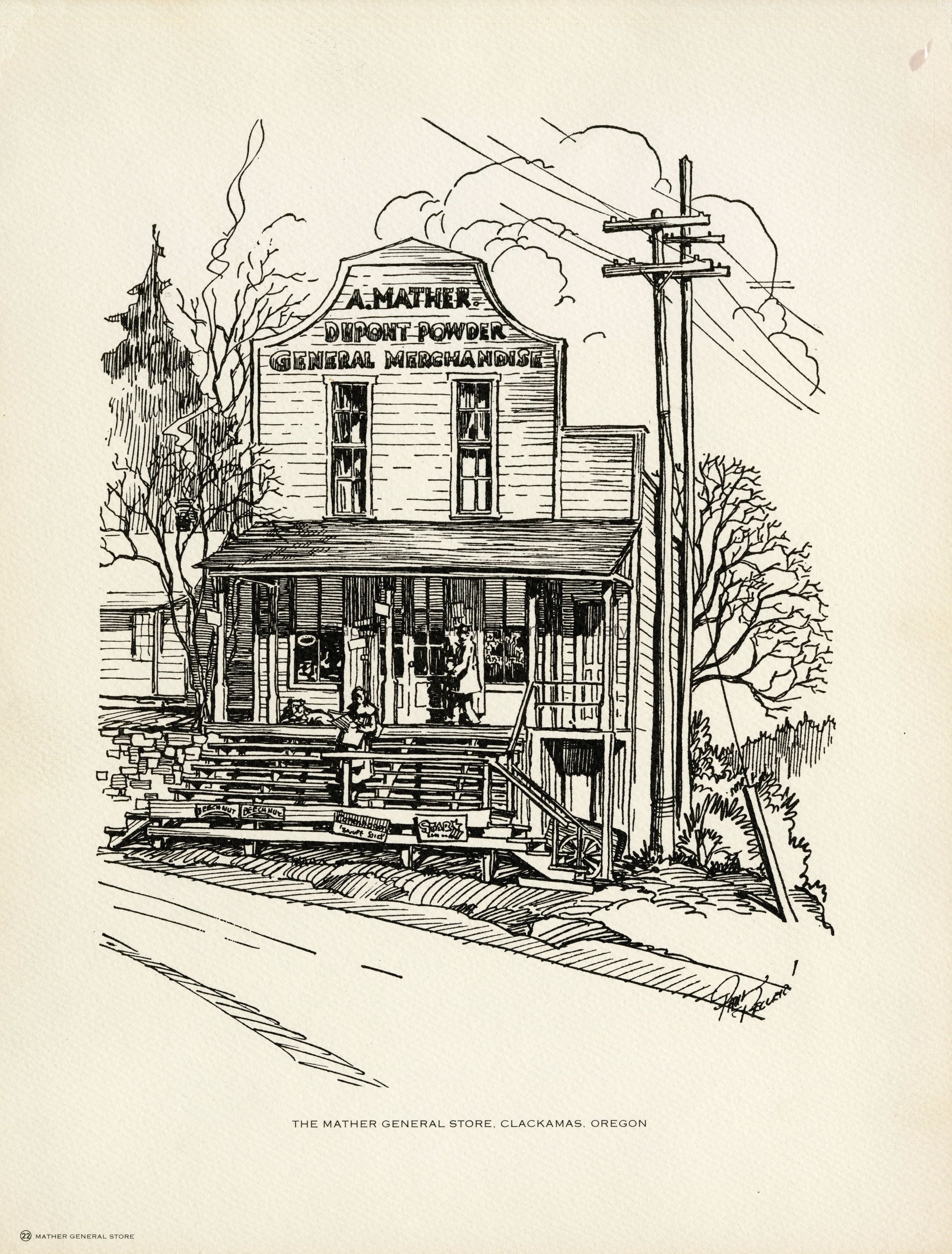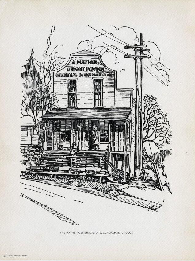 Mather General Store, Clackamas, Oregon. Pencil sketch.Made/Created