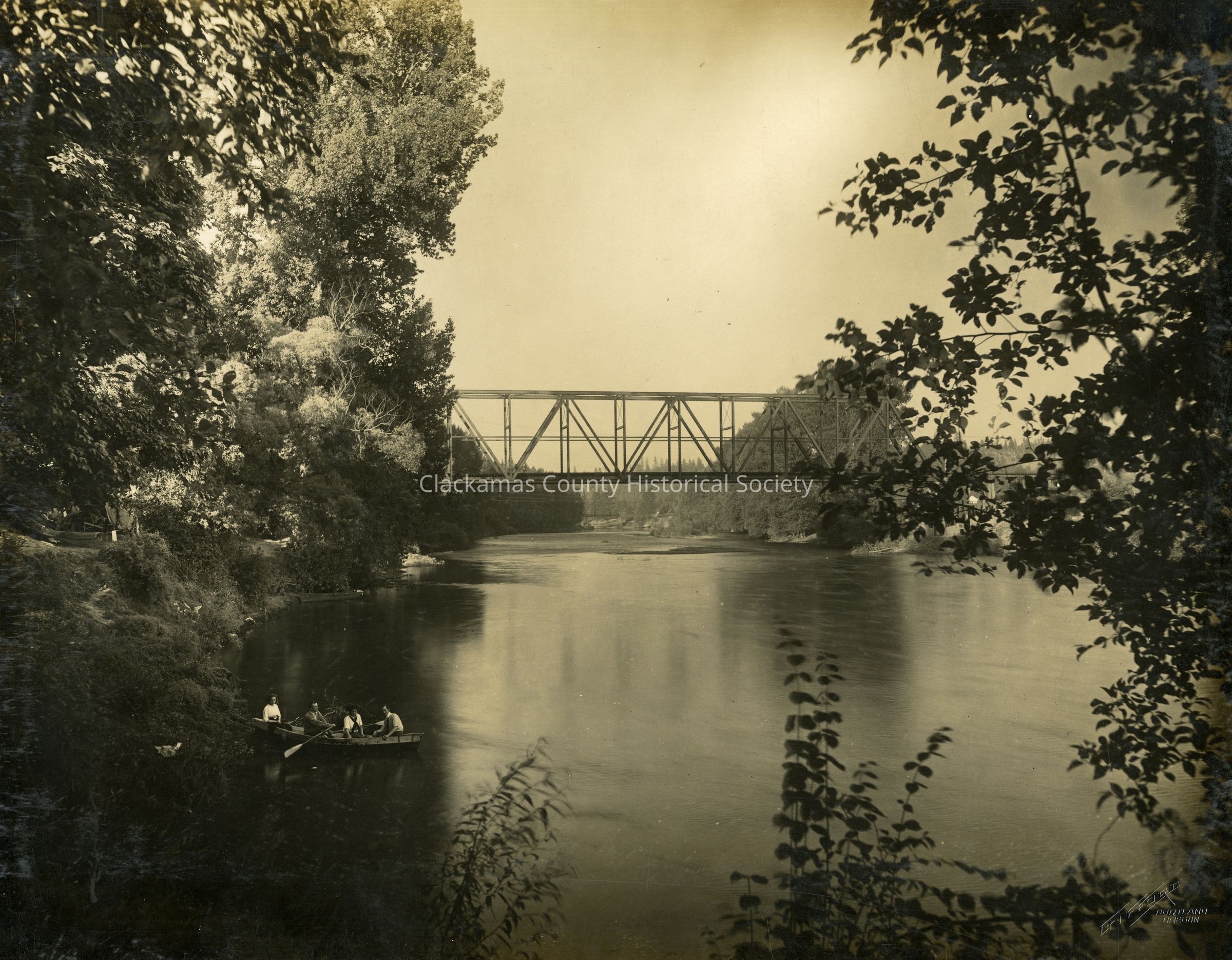 Clackamas River Men in a boat Railroad Bridge