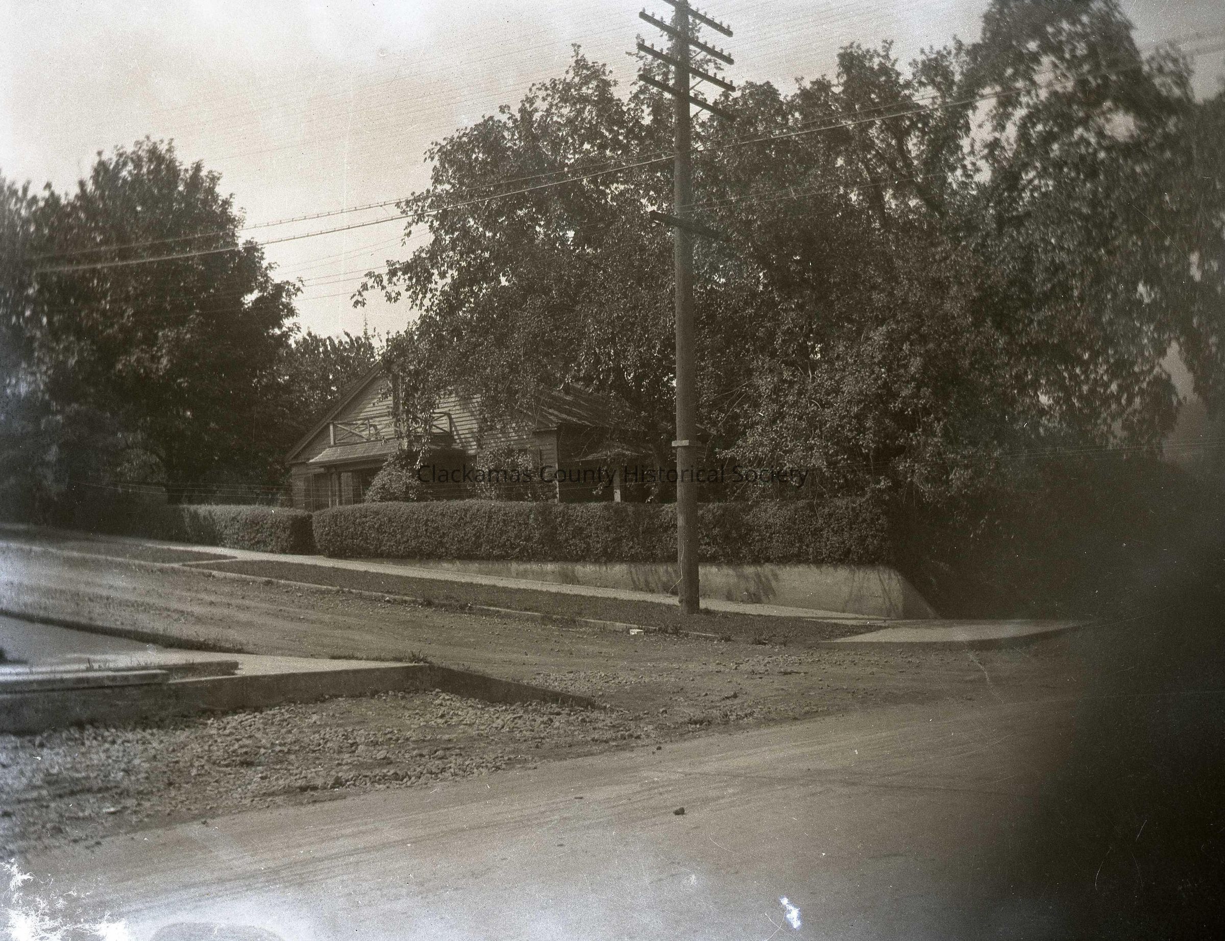 Cochran House (#3), Southwest corner at 12th and Washington Streets, Oregon City, Oregon. The concrete wall under the hedge remains. (JAH 2/2026)Made/Created