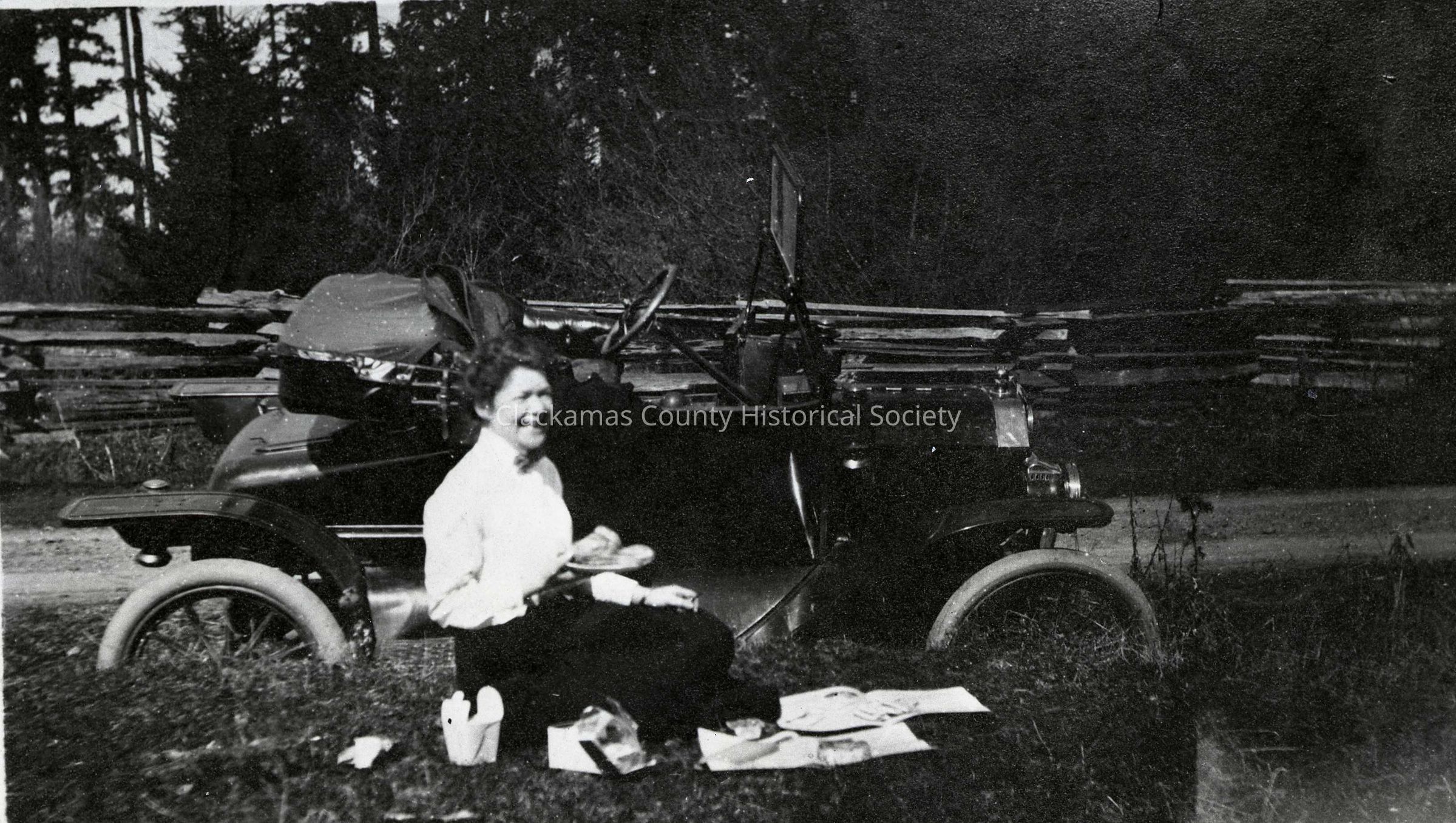 Nan Cochran on a roadside Picnic. Model T Ford