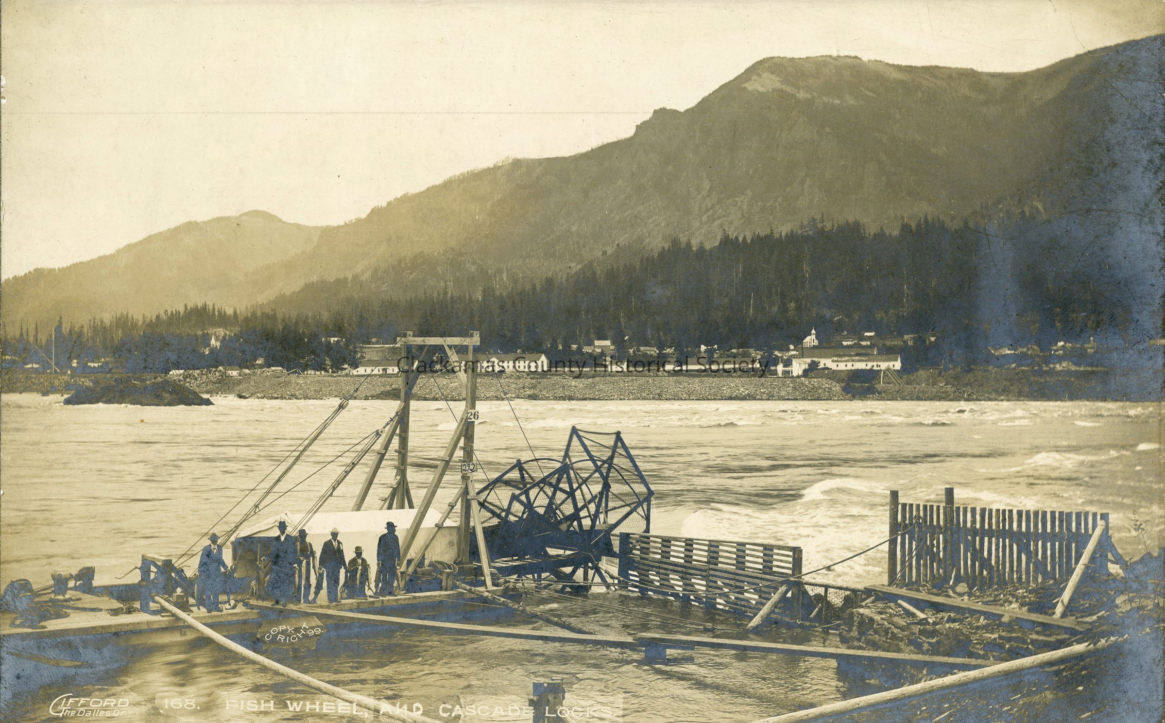 Fish wheel on Columbia River with Cascade Locks in background. Gifford Studio - The Dalles, Oregon