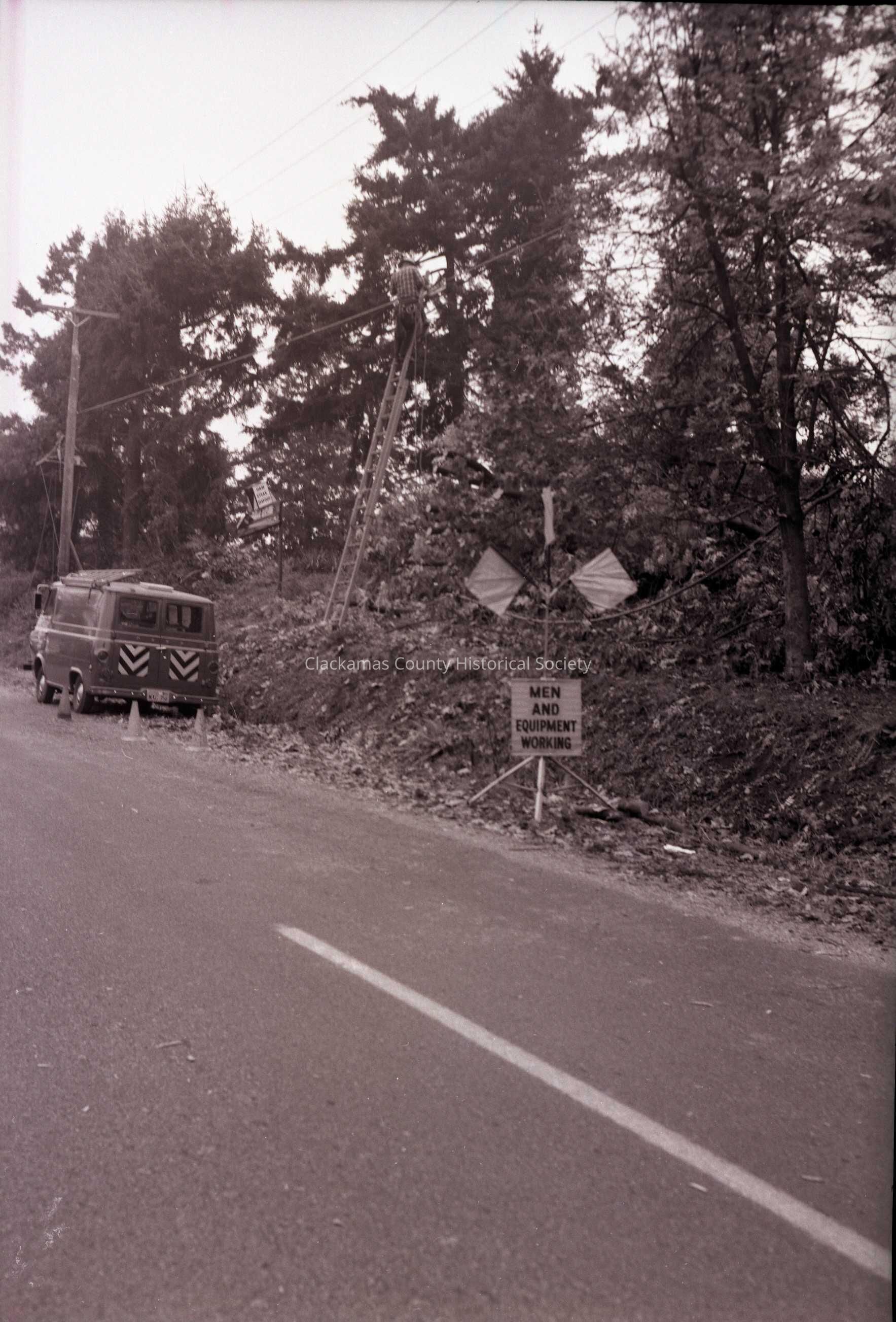After Columbus Day Wind Storm, 1962, telephone workman at work.