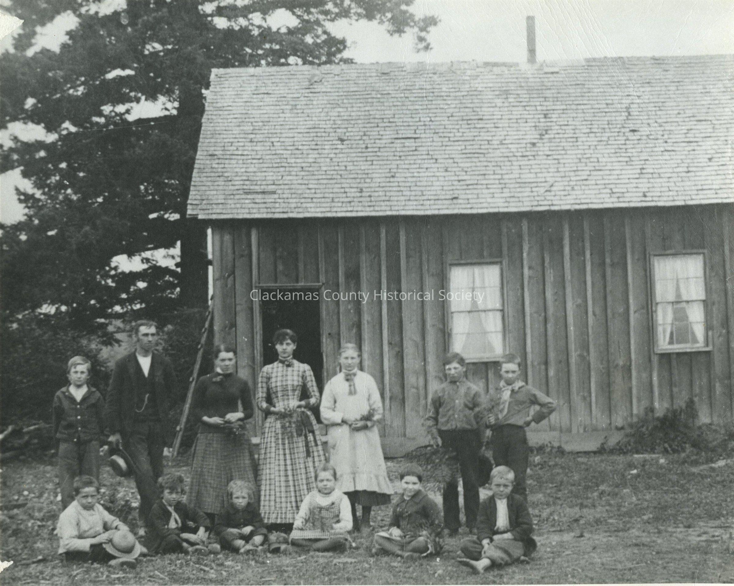 Neta Barlow (teacher in plaid dress), graduated in Class of 1885 from Oregon City High School.