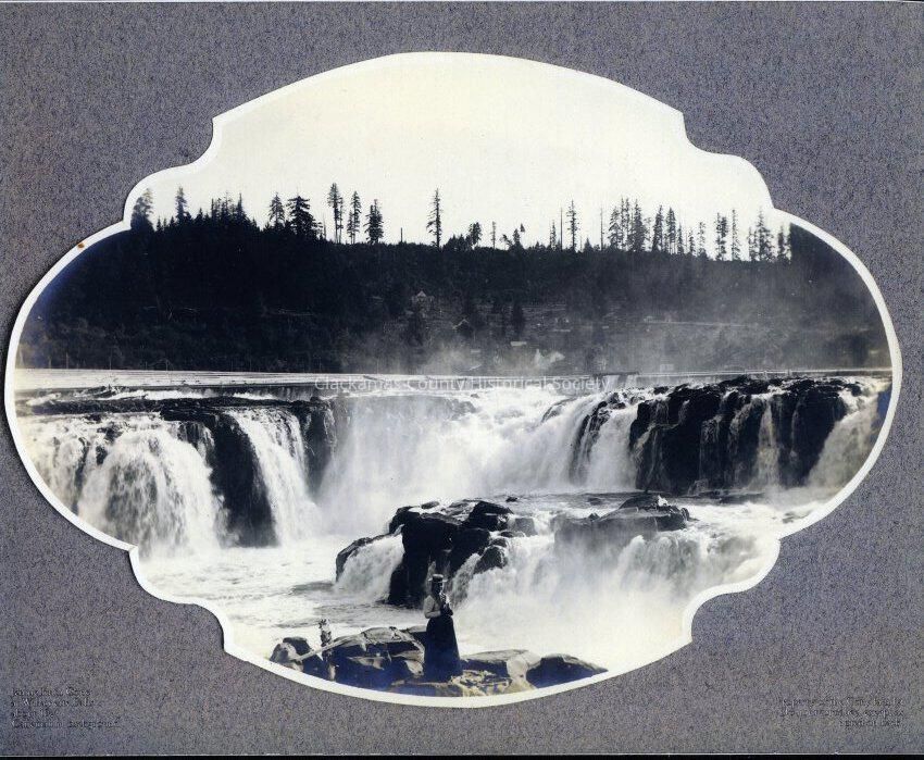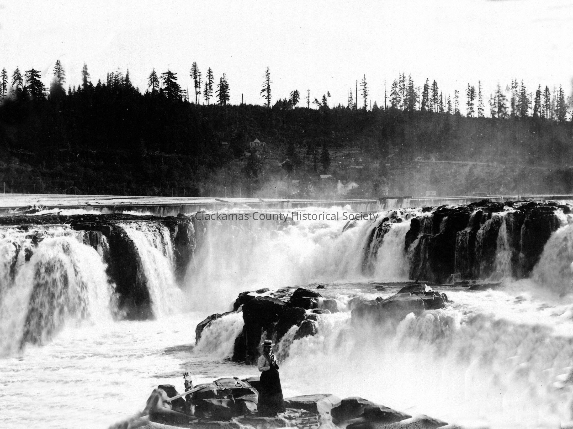 Cone, Jennie Ruth in front of Willamette Falls.Entry/Object ID