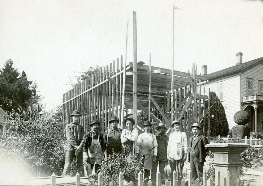 Construction of building on Main Street, Oregon City, Oregon. Back states that this was being built on the "Court House lot" next to the alley before the Courthouse was built.Made/Created