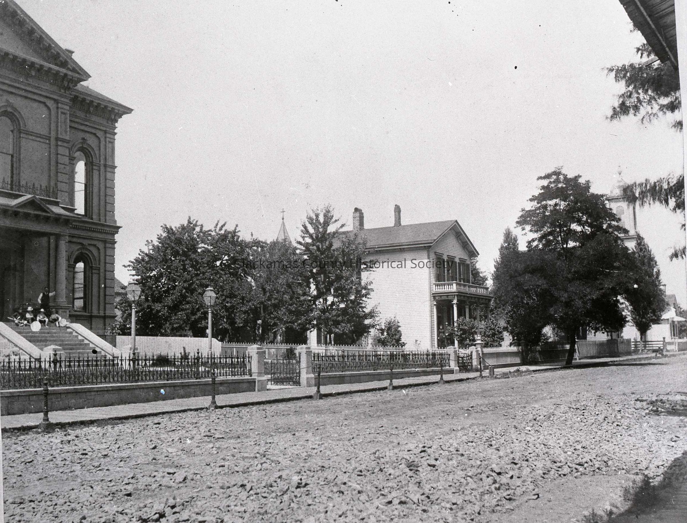 Court House and Mary Charman Residence, West side of Main Street between 8th and 9th Streets, Oregon City. The Charman House later became the site of Liberty Theater.Made/Created