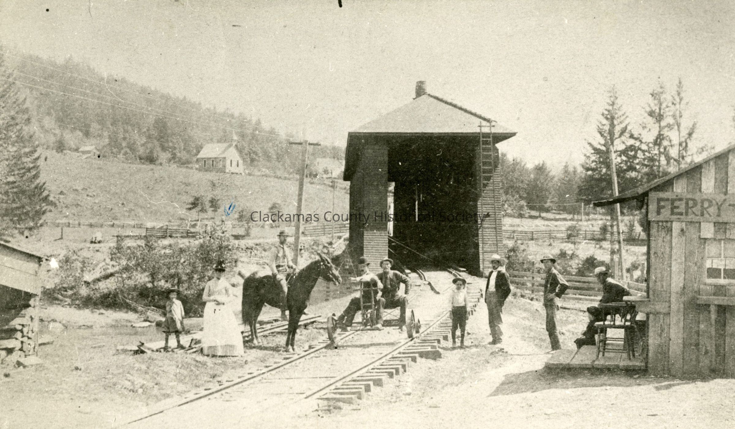 Covered Railroad Bridge at Park Place. Cross family in view. Park Place School on hill.