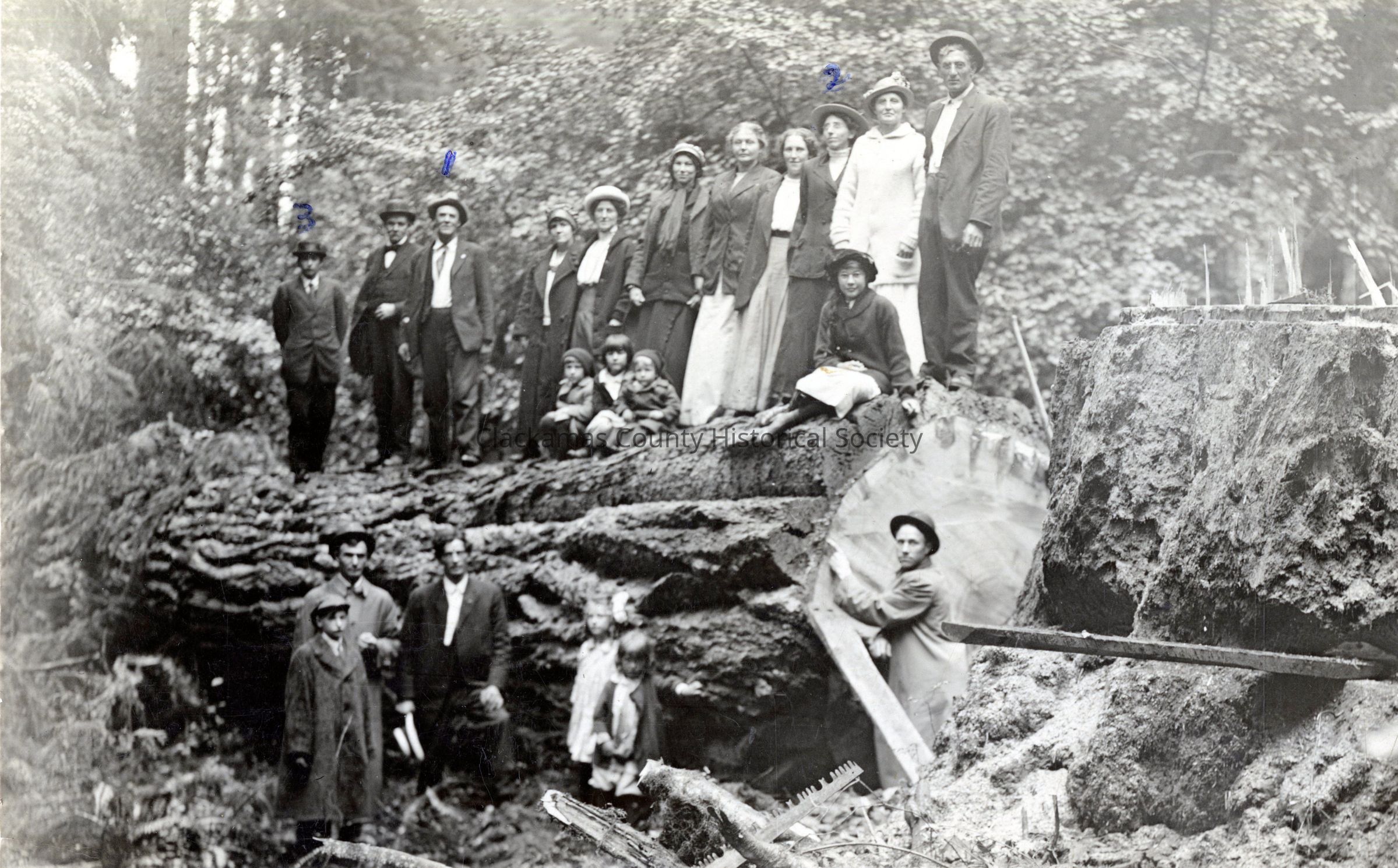 Family group standing on a large log that has been cut down.Inscription/Signature/Marks
