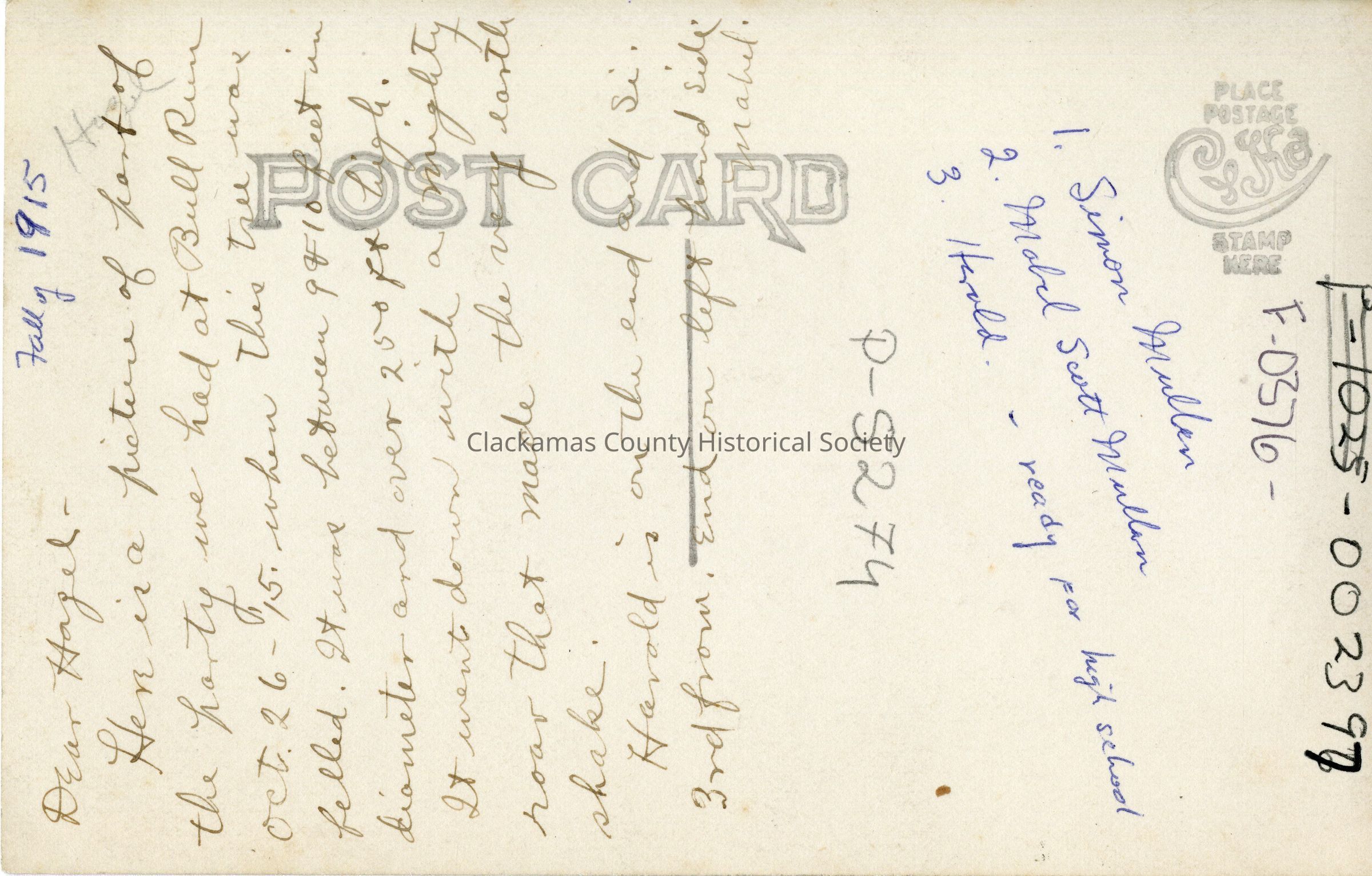 Postcard photograph of a family party at Bull Run, October 26, 1915. Simon Mullen (3rd from left, standing), Mabel Scott Mullen (3nd from right, standing), Harold Cross (1st on left standing)