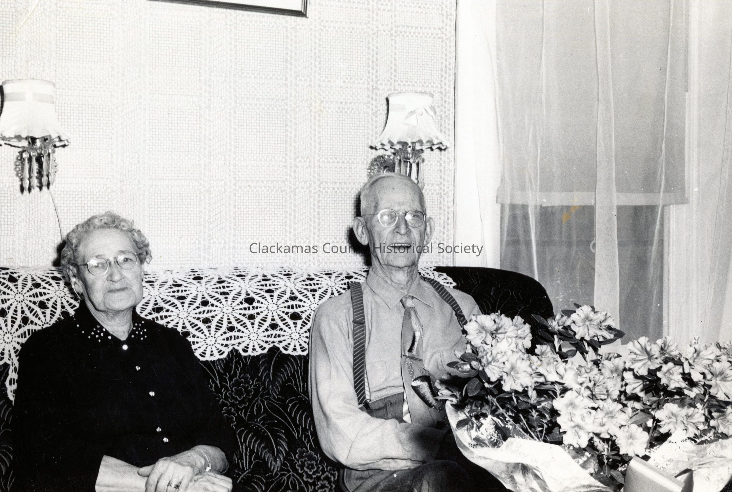 Frank and Lillian Cross 60th wedding anniversary in 1951. Sitting together on a sofa with bouquet of flowers in foreground.