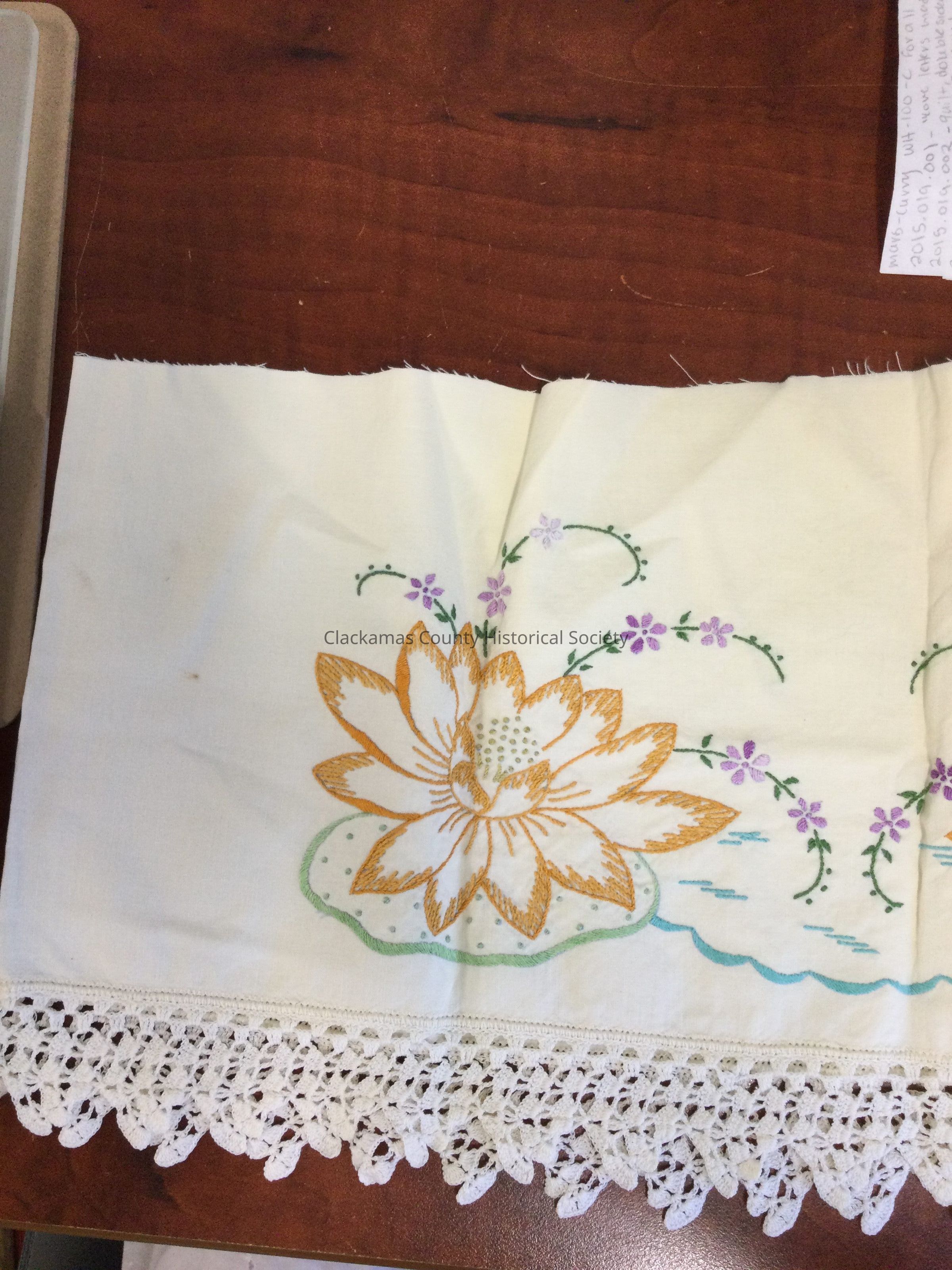 Cut cloth, cream, with lace trim and large embroidered colorful flowers.