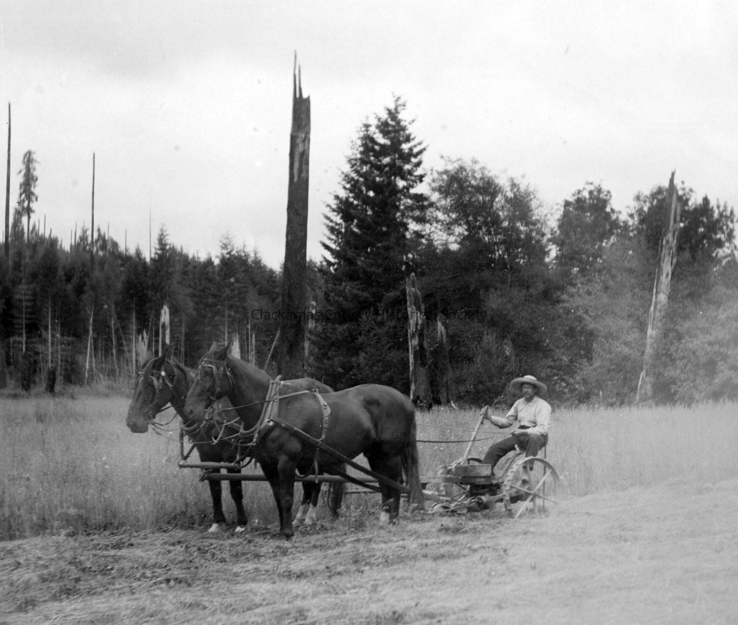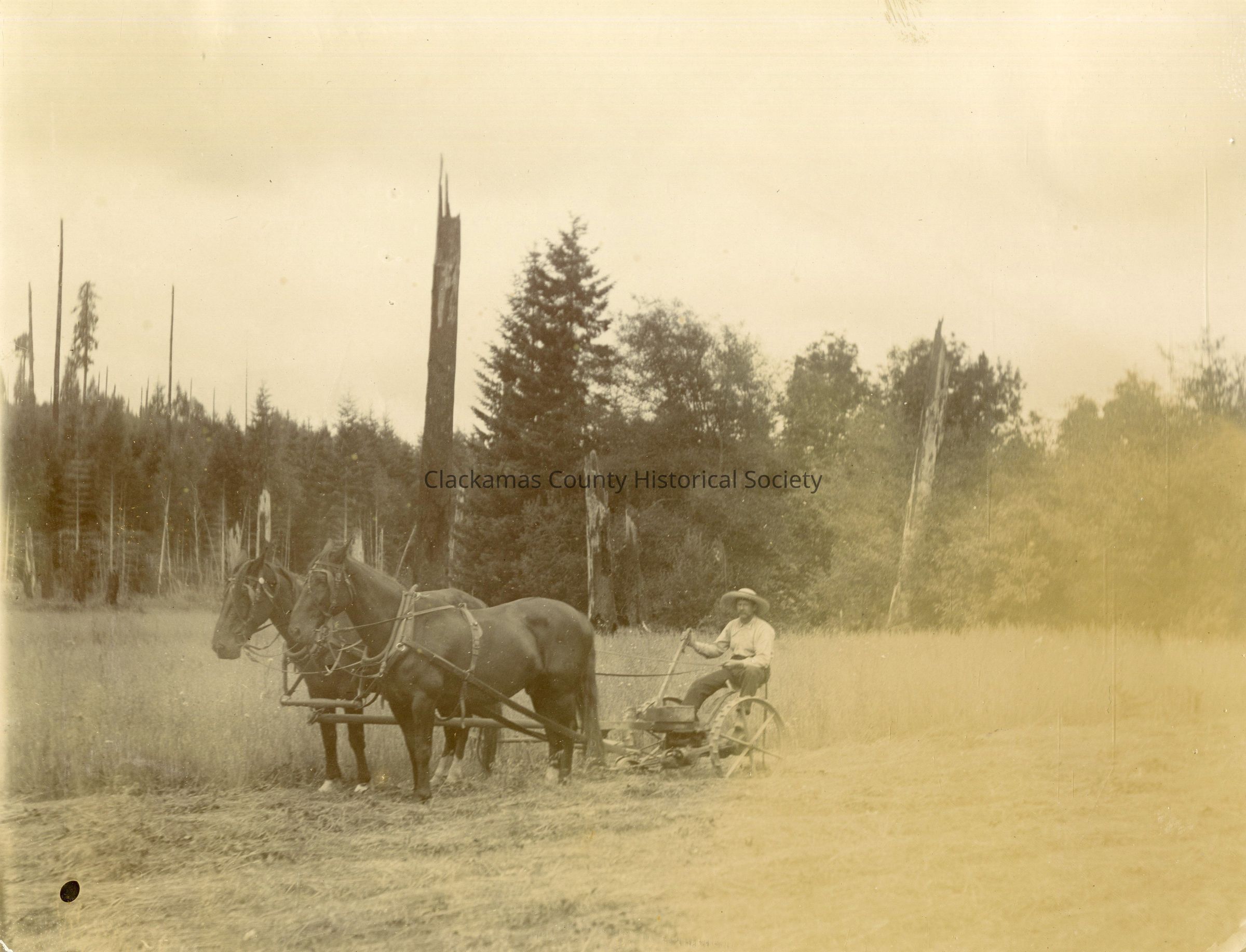 Farmer cutting grain with horse-drawn sickle.Made/Created
