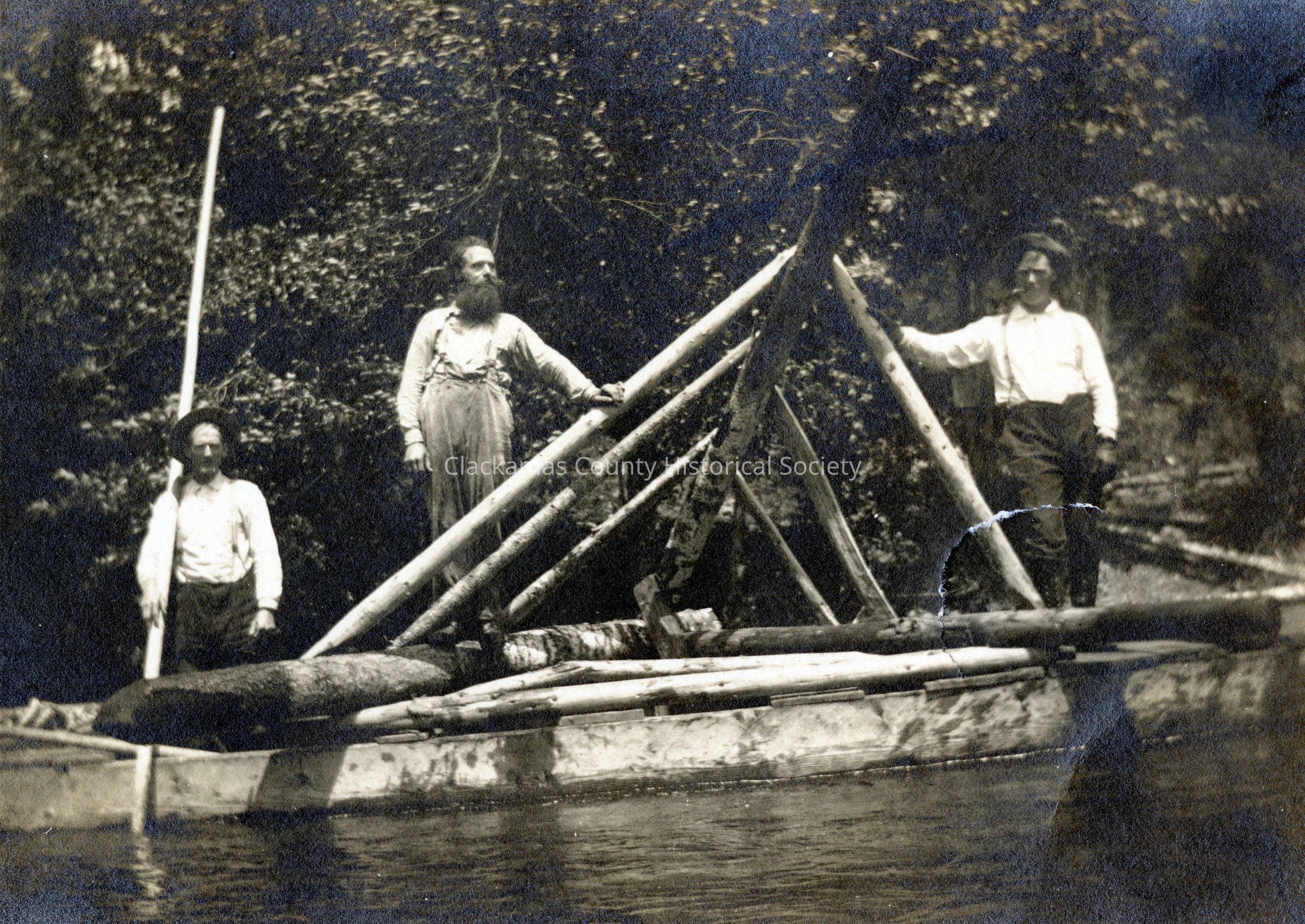 Post Card of Unknown Men on a log raft structure. Location and Date Unknown. On back it has the name Mollie. Talbert Collection