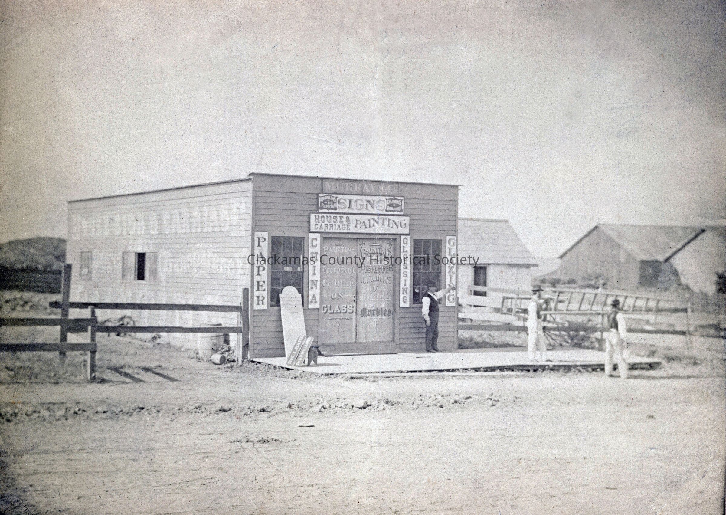 Store building, location unknown. Unidentified but might be owned by "Murray" that is just visible on the top of the garage. Unidentified people. Looks like a store and shop for paint, carriages, china and paper.Made/Created