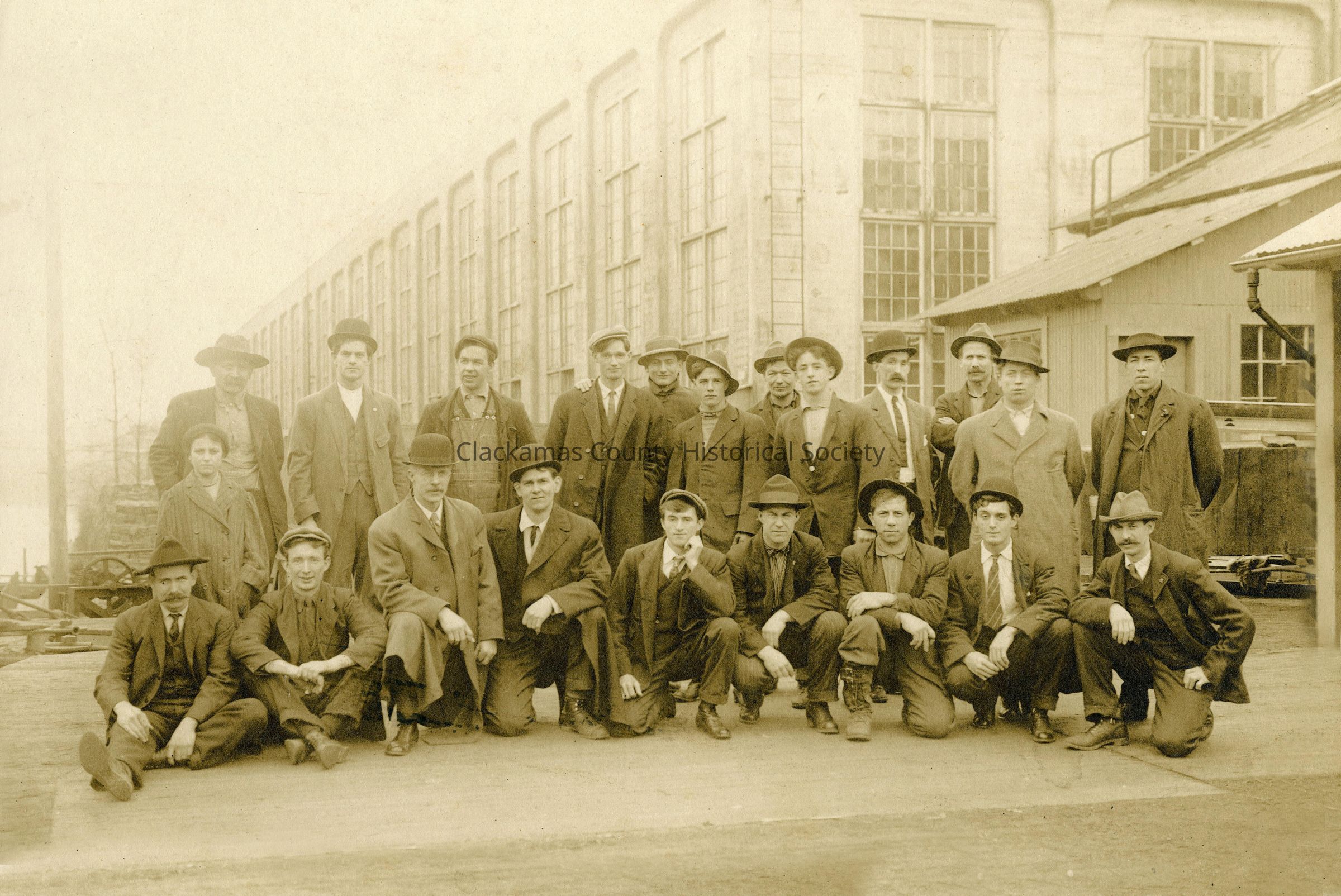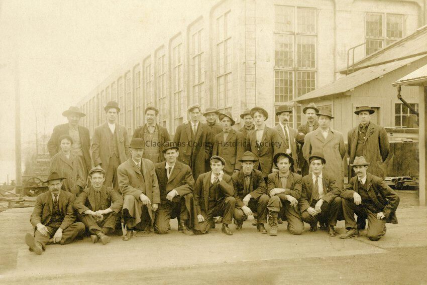 Woolen Mill Workers. "Uncle" Francis McGahney in back row, fourth from left, in overcoat and necktie. Person behind him has his hand on Francis shoulder. Mill in background. Hawley Pulp and Paper office on the right.Made/Created