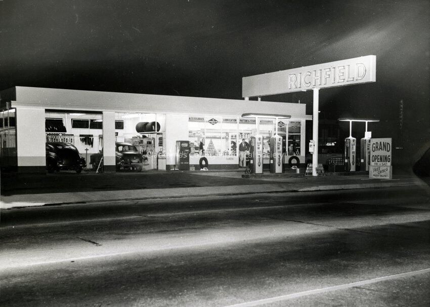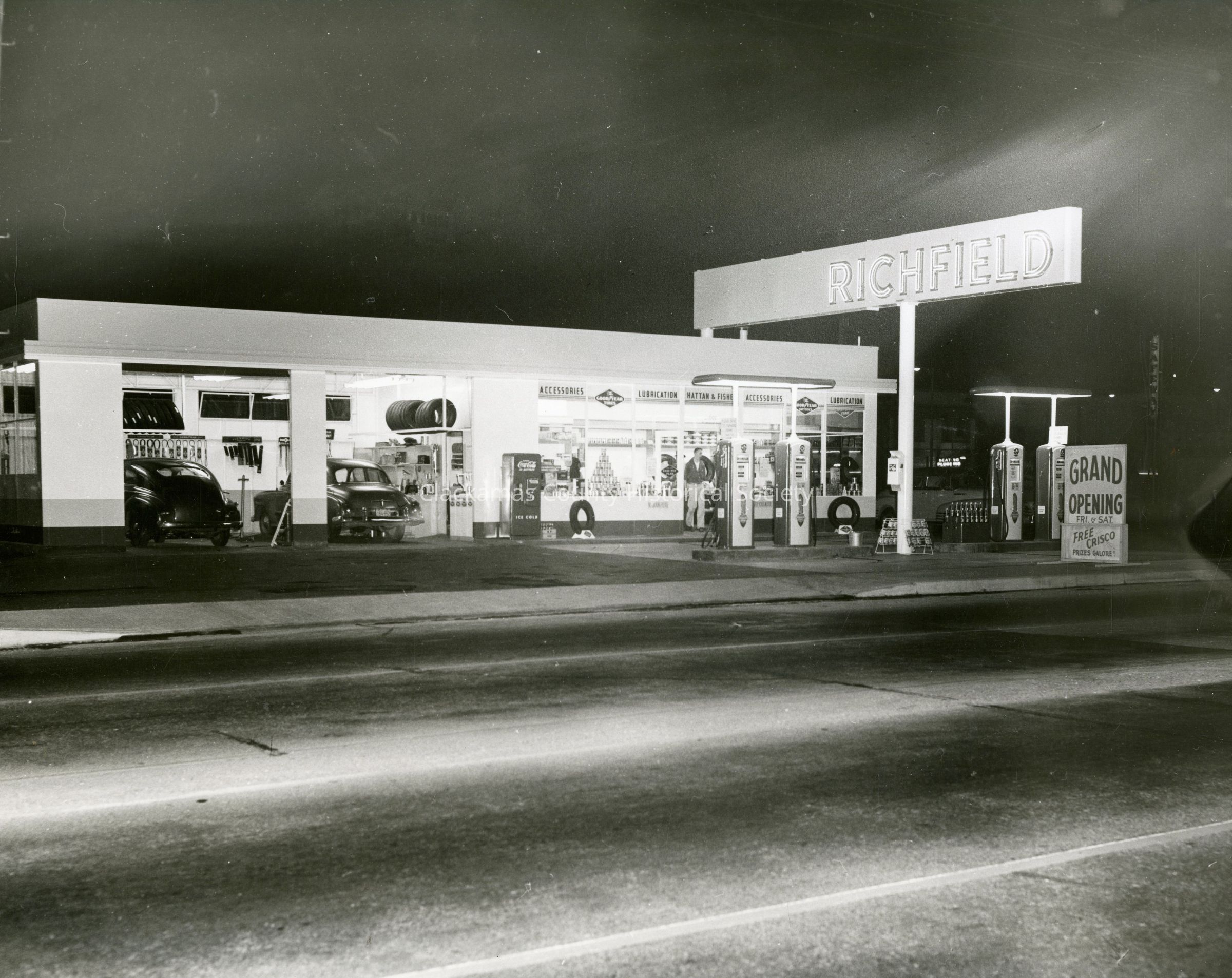 Hattan and Fisher Richfield Gas Station, Grand Opening. 195_ on back of photo. Richfield gasoline. Cars and unidentified person. Gas pumps. 1002 McLoughlin Blvd.Made/Created