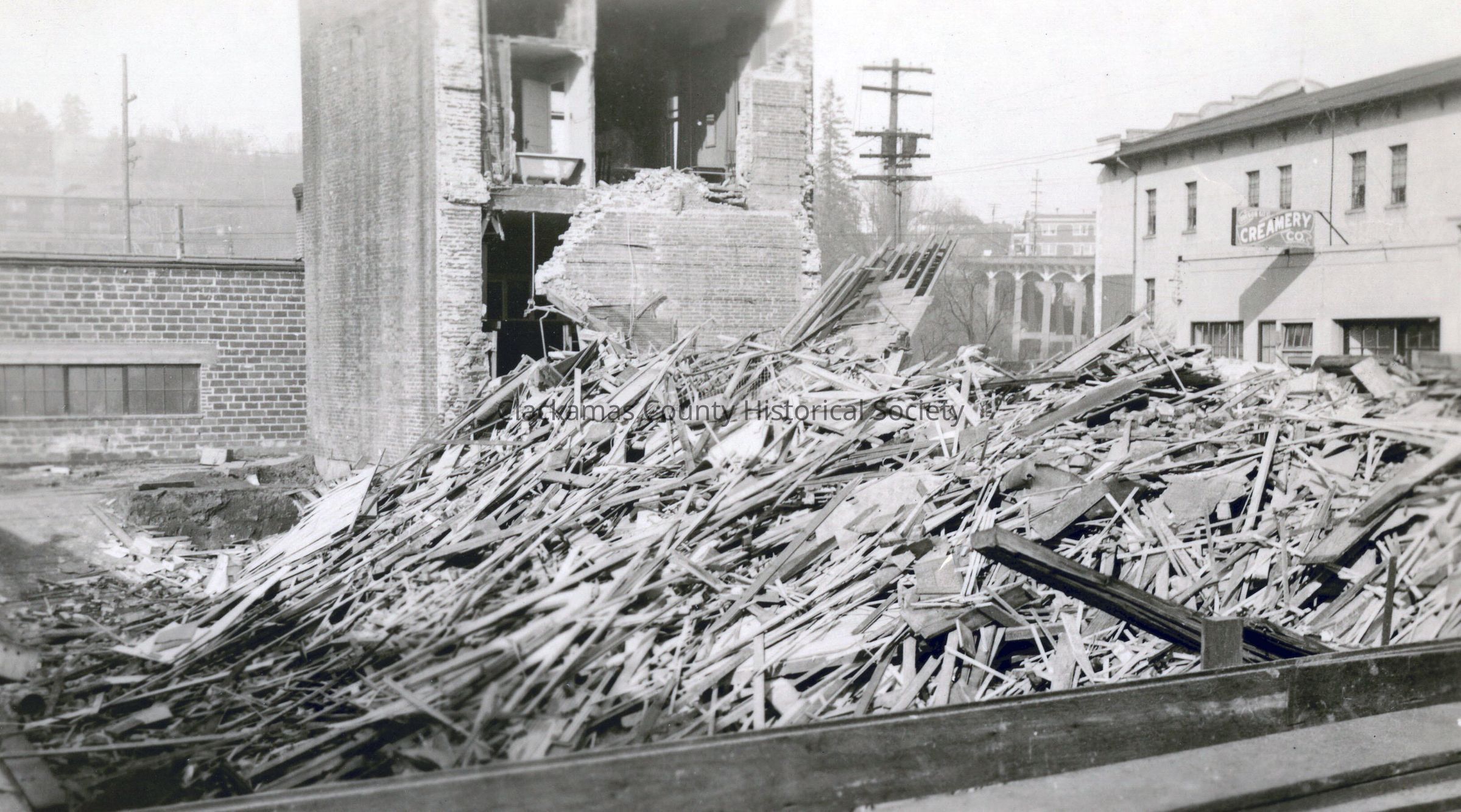 Terminal Hotel. Demolition of hotel. Oregon City Creamery in background. Main Street in background.Made/Created