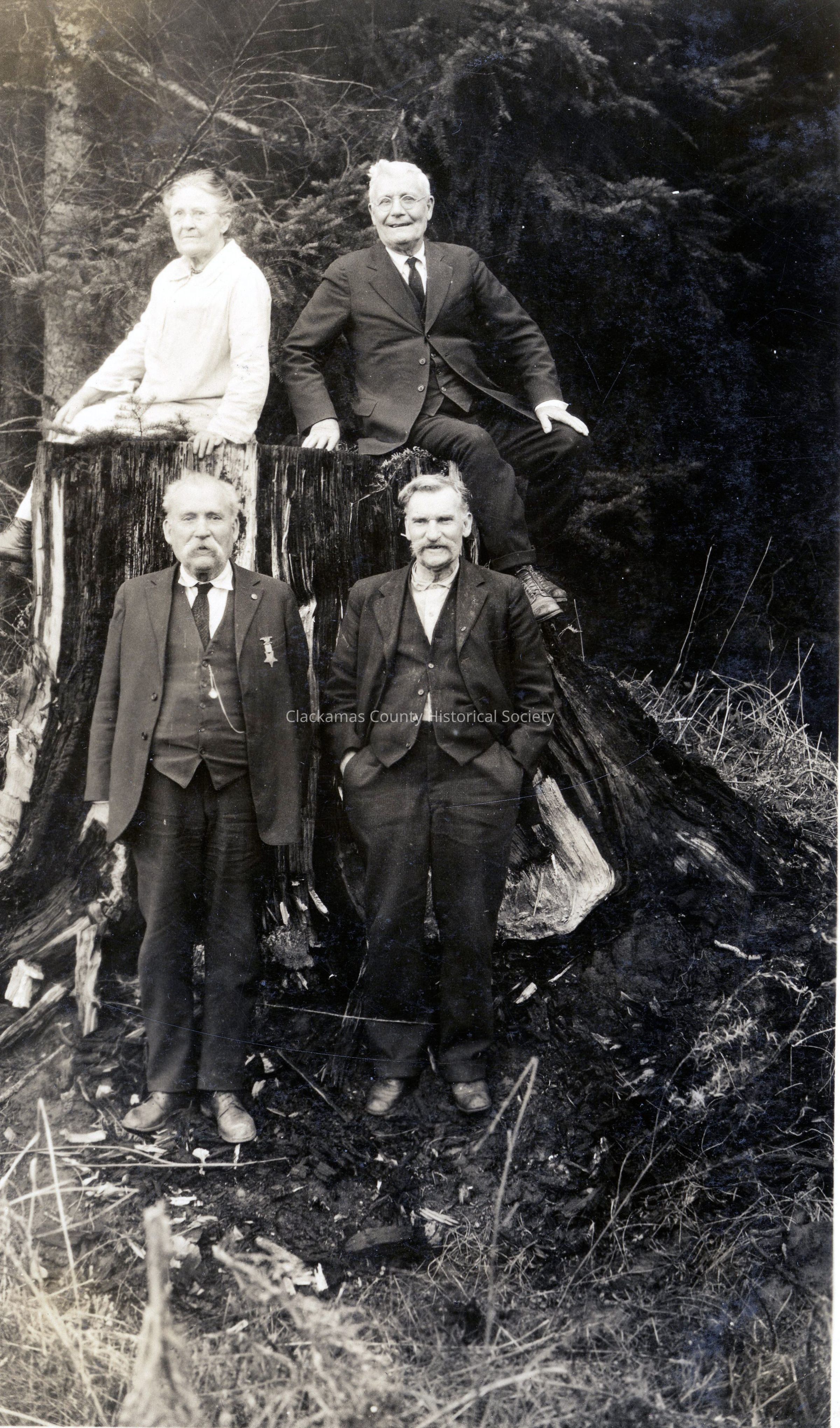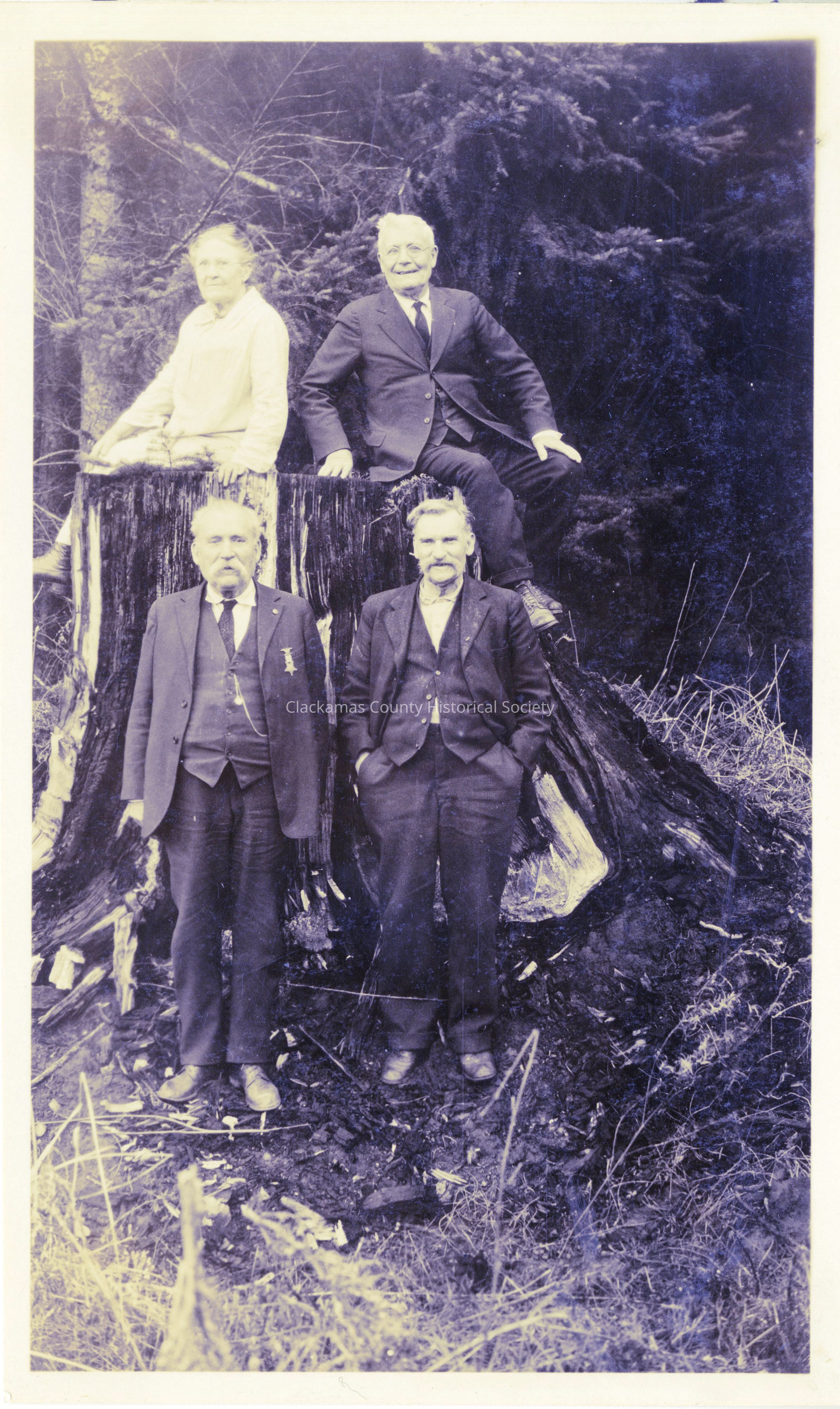 Emma (Talbert) Davis (l), unidentified man (r) on large tree stump. Joe Davis (l) and Jehu Davis (r) standing.Other Names and Numbers
