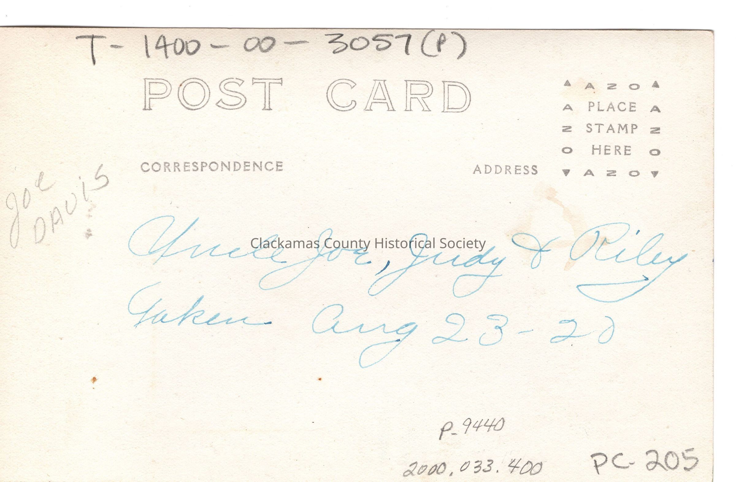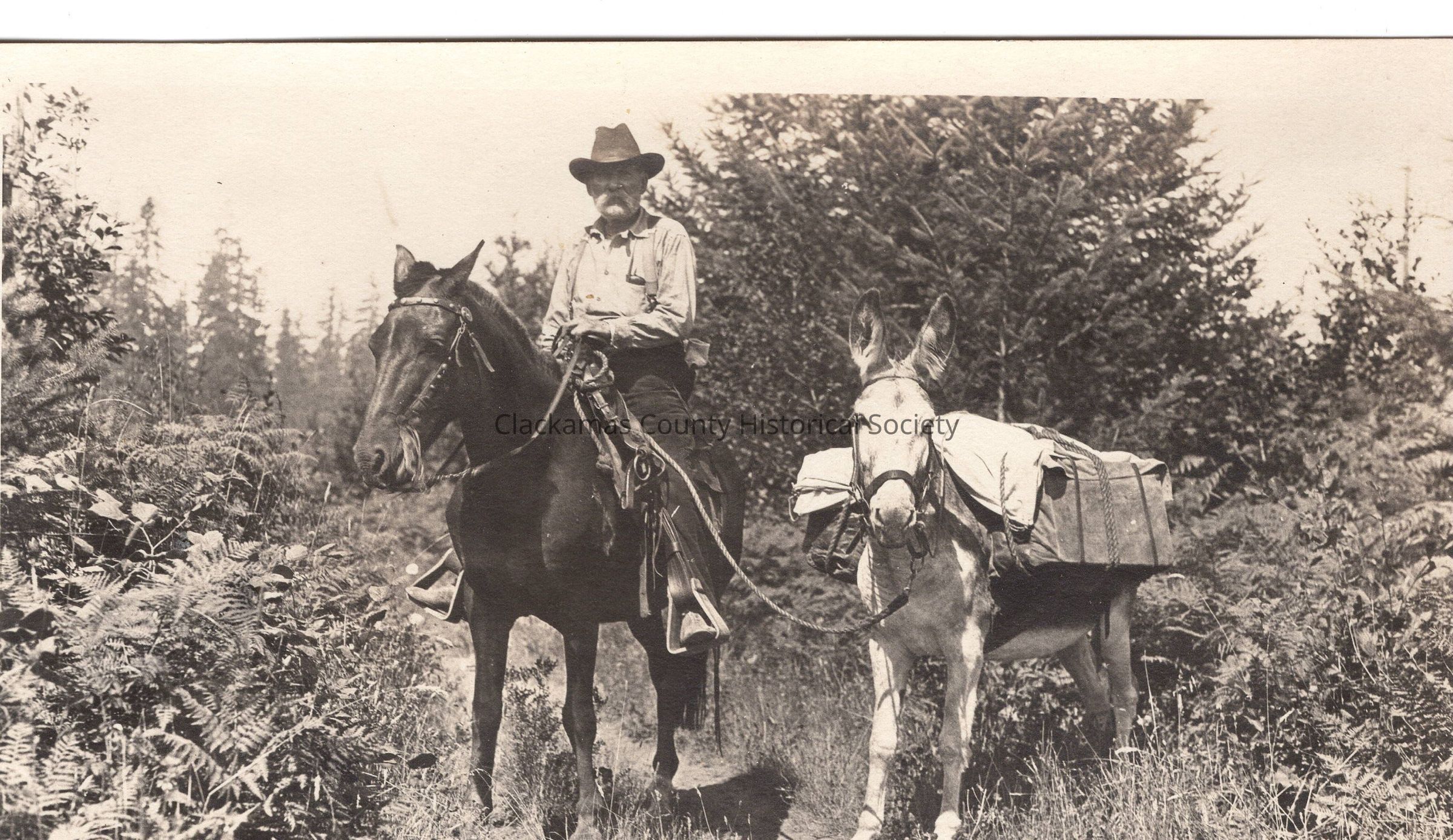 Photograph post card of Joe Davis , horse "Riley" and mule "Judy"