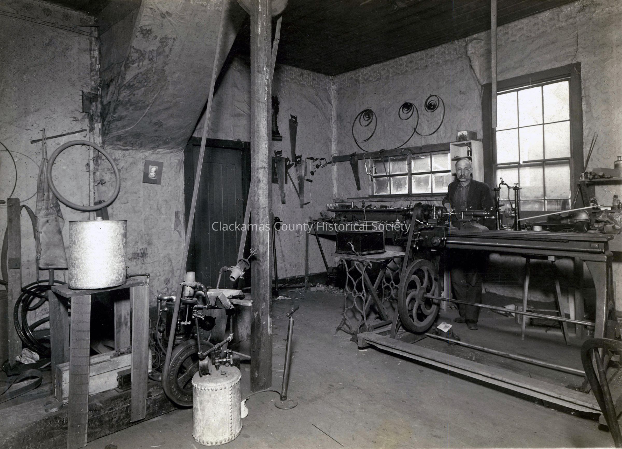 Searles Shop. Shop area is in back of Jones Drug Store. 1910. Shop appears to be a musical instrument shop. Violin on the table. Person is in the shop.Made/Created