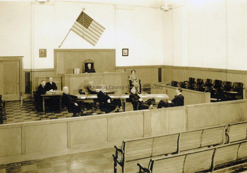 Circuit Court Room, Clackamas County Court House. Judge Earl C. Latourette; Clerk Guy Pace; Bailiff Ed Shaw; Witness Helen Waddell (Judge's Secretary), Reporter R.B. (Roll) Runyan. Lawyers Table (L-R): 1) Joseph E. Hedges; 2) George L. Hibbard; 3) Alden E. Miller; and 4) Arthur G. Beattie.Made/Created
