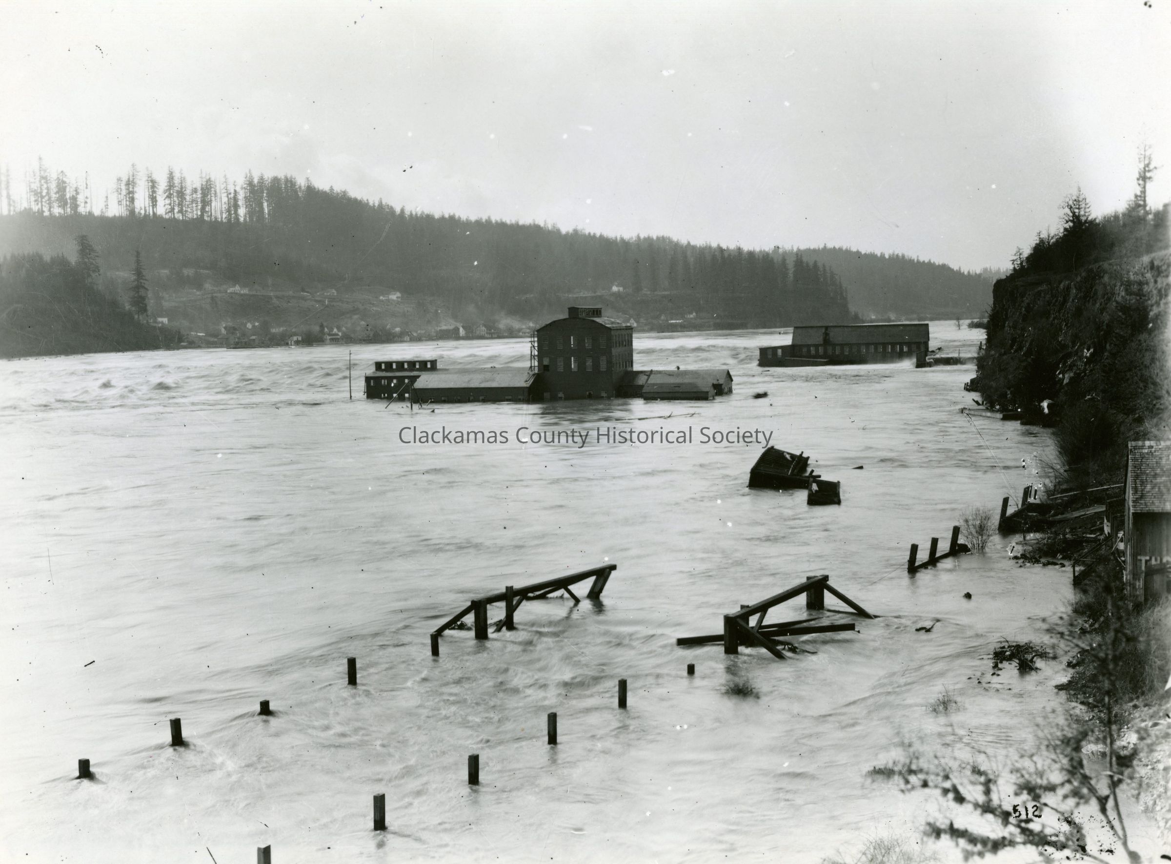 Willamette Falls 1890 Flood. Buildings shown along river. Photo appears to be from West Linn side of river looking southeast. Willamette Falls Locks, Crown Paper Company, Willamette Pulp Mill.