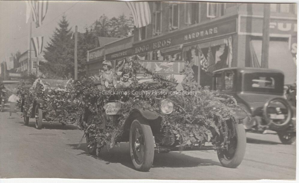 Decorated vehicle in parade on Main Street, Oregon City Oregon, Year unknown