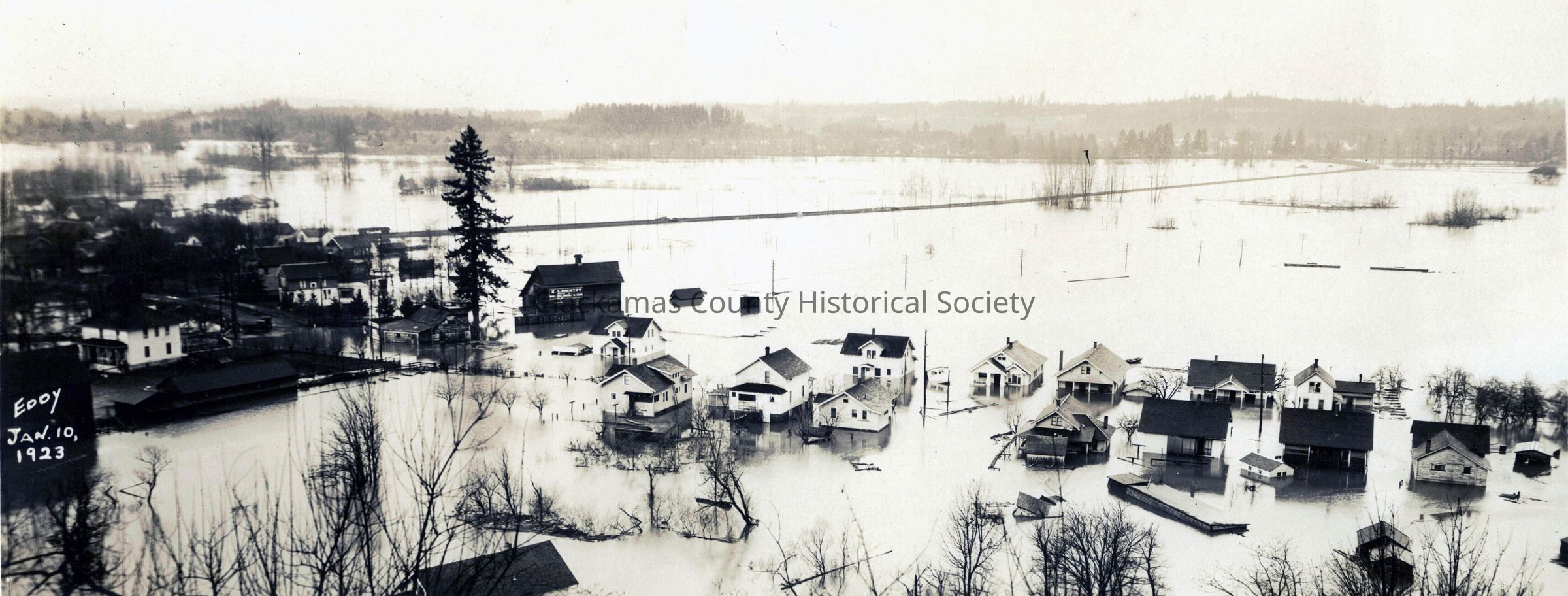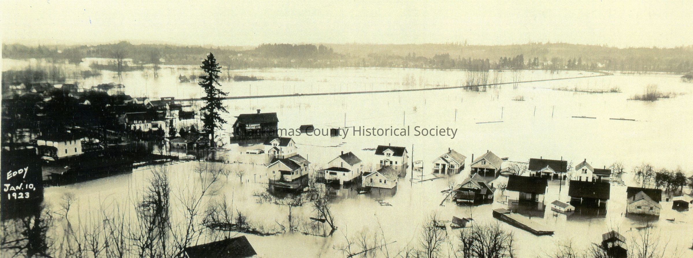 1922-1923 Flood, Panorama View from Buena Vista area of North Oregon City. Hackett Company in the background. The photo was taken at Atkinson Park on the Bluff.Made/Created