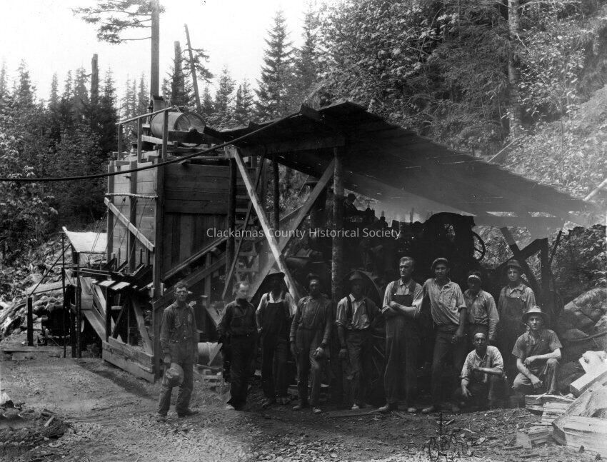 Dover Rock Quarry, 1929. 11 men in front of crusher. Dover was SE of Sandy. Men named from left side are: 2nd - Dick Reynolds; 3rd-Roy Baker; 6th-August Scheer; 7th-Ben Heinz. Far right, kneeling is Walter Fisher, contractor from Carus. Crushed rock, Wapinita cutoff.Made/Created