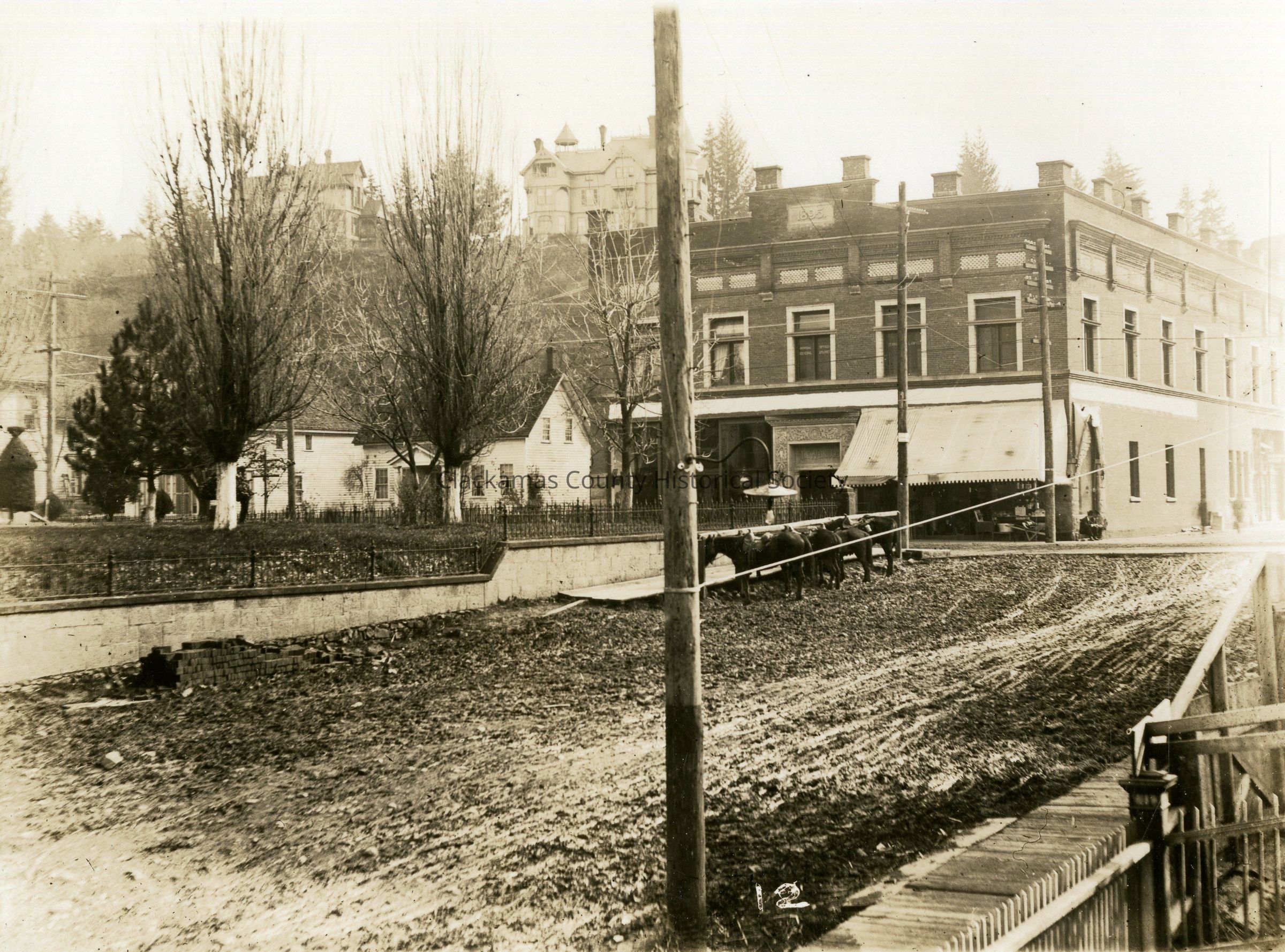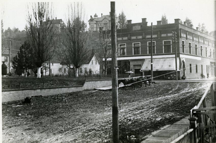 8th and Main Street, Oregon City. Horses in street. Dirt streets.Made/Created