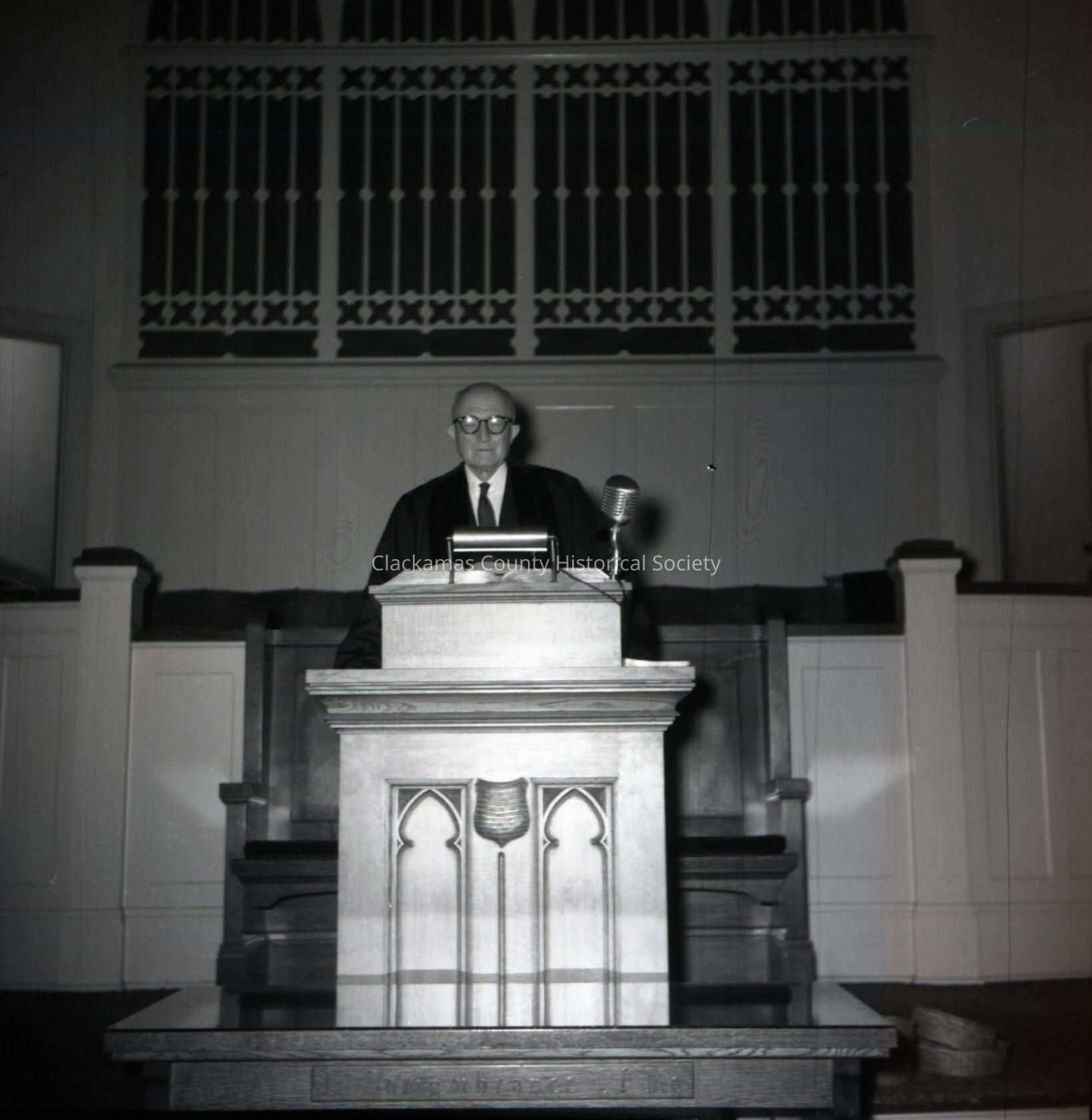 Dr. Kenneth Scott Latourette at pulpit in Atkinson Memorial Church, Oregon City. He was a missionary and historian. the son of DeWitt Clinton Latourette and Ella (Scott) Latourette. His mother and father both attended Pacific University in Forest Grove, Oregon, where they both graduated in 1878. DeWitt Clinton Latourette was a lawyer in Oregon City. In 1904, Latourette was awarded a Bachelor of Science degree from Linfield College in Oregon. He continued his education in New Haven, Connecticut at Yale, earning his BA in 1906, his MA in 1907 and his PhD in 1909.[Made/Created