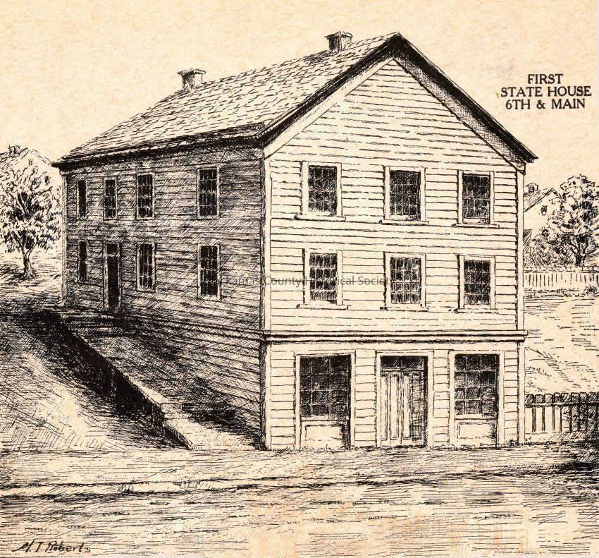 Copy of a drawing by M. I. Roberts of the first State House. The building stood at the southeast corner of 6th and Main Street, and is better known as the Oriental Hotel. The building was built by John Morrison and later sold to Harley Stevens Sr. Demolished long ago, a parking lot is in the current location.