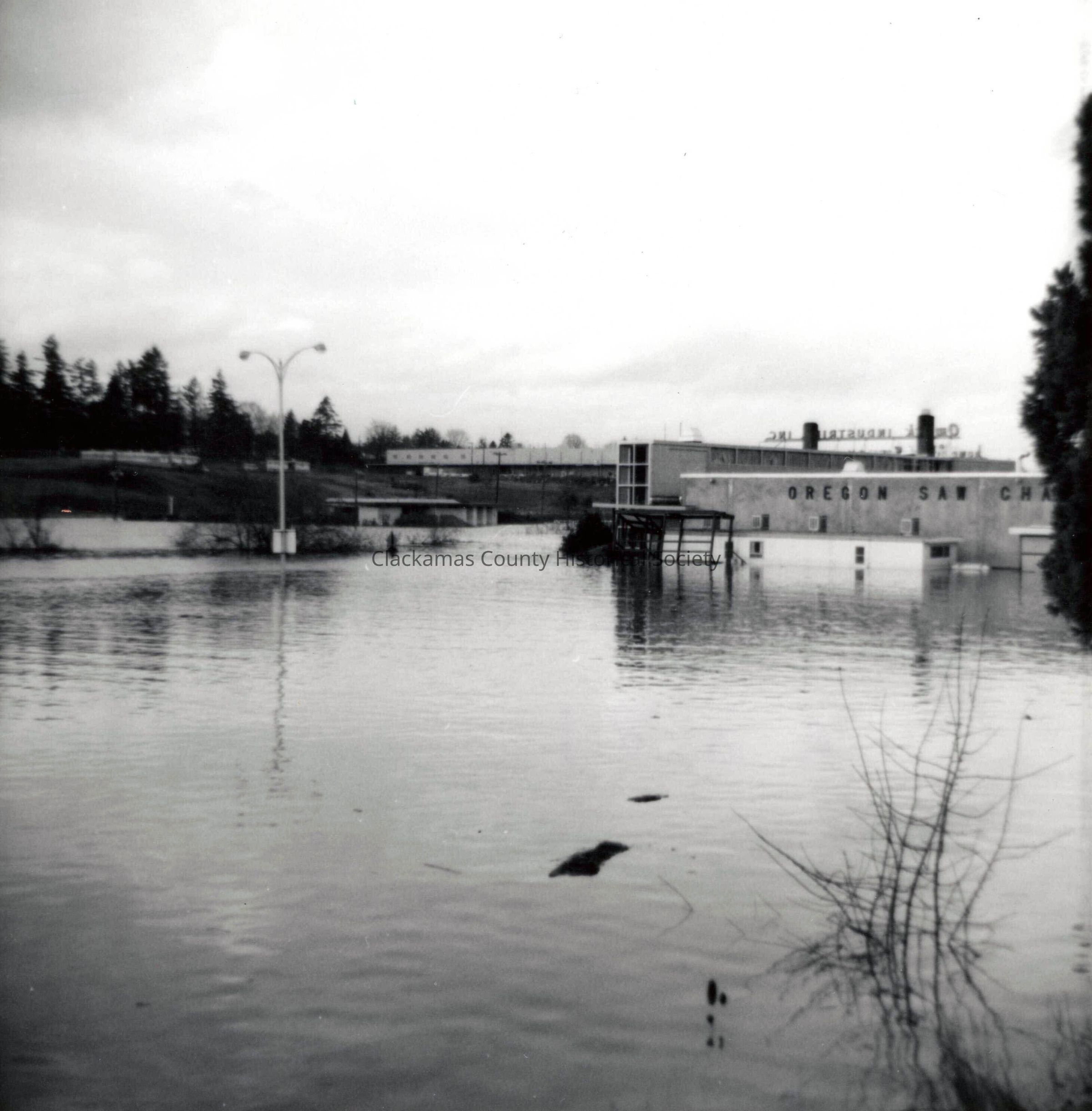 1964 Flood. Flood waters. Oregon Chain Saw Company, Milwaukie, OR. Flood waters around buildings.Made/Created