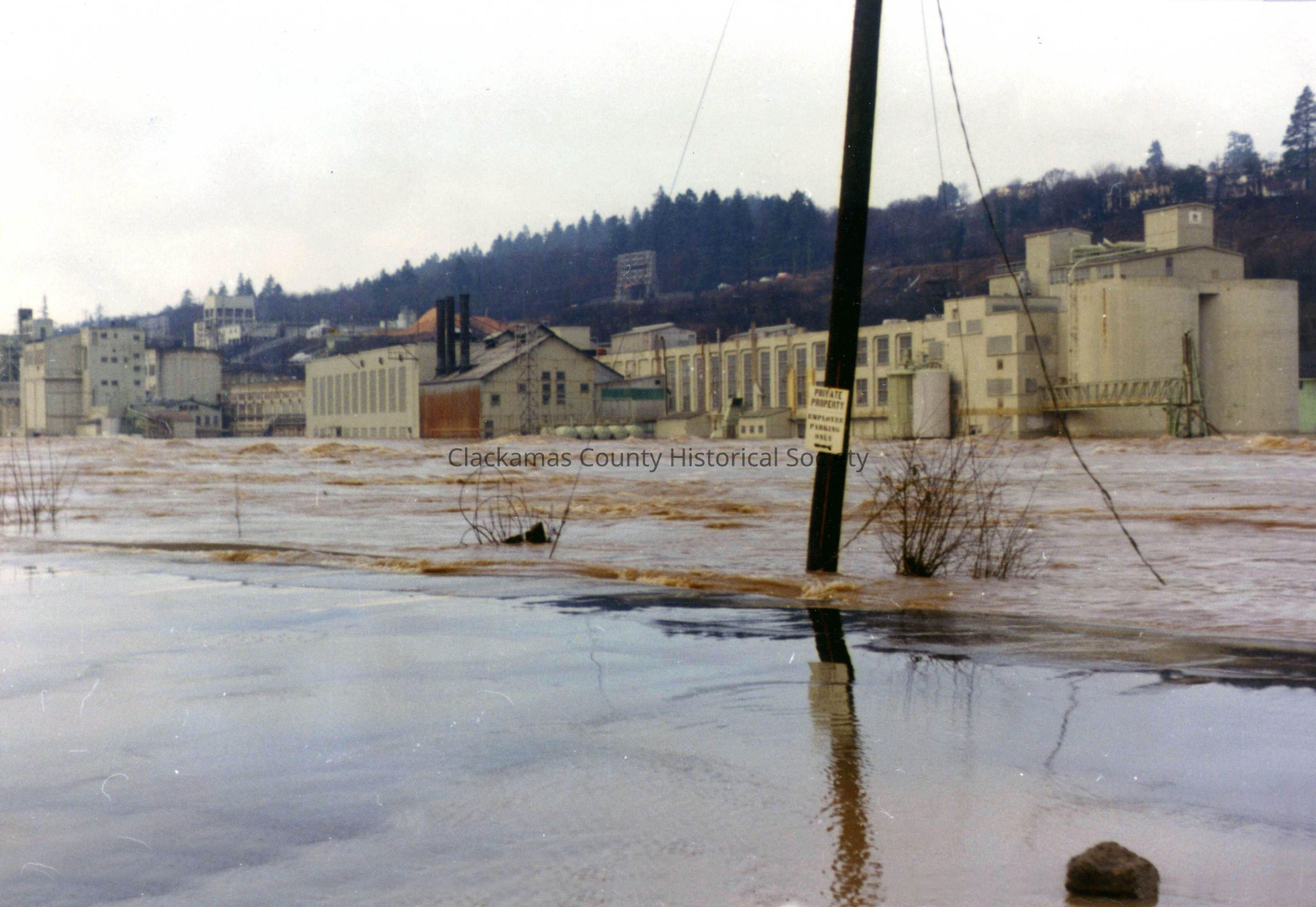 1964 Flood. West Linn Mills. Photo from Oregon City, 5th and Mcloughlin, looking across the river. Flood waters. December 1964 on photo.Made/Created