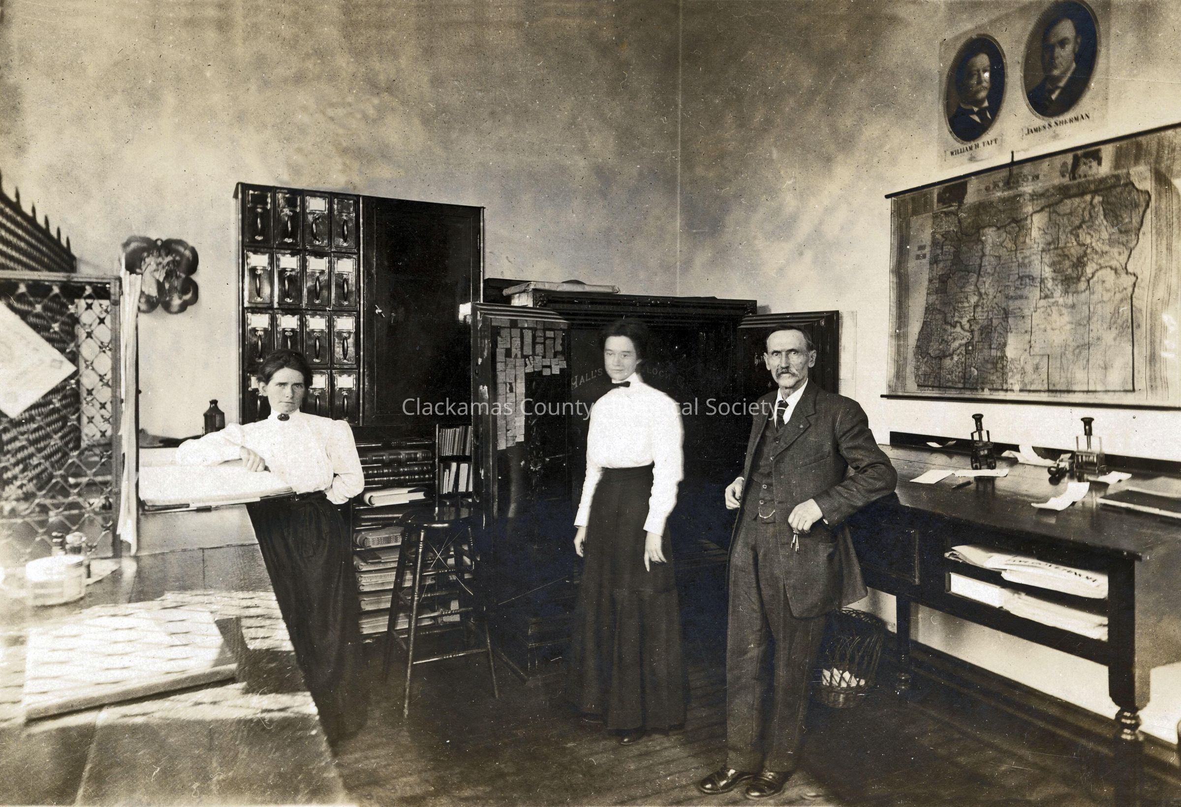 Courthouse Office for Clackamas County. Photograph shows three employees: 1) J.C. Paddock, 2) Ava Marr (?), and 3) Jess Paddock.Made/Created