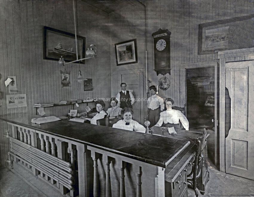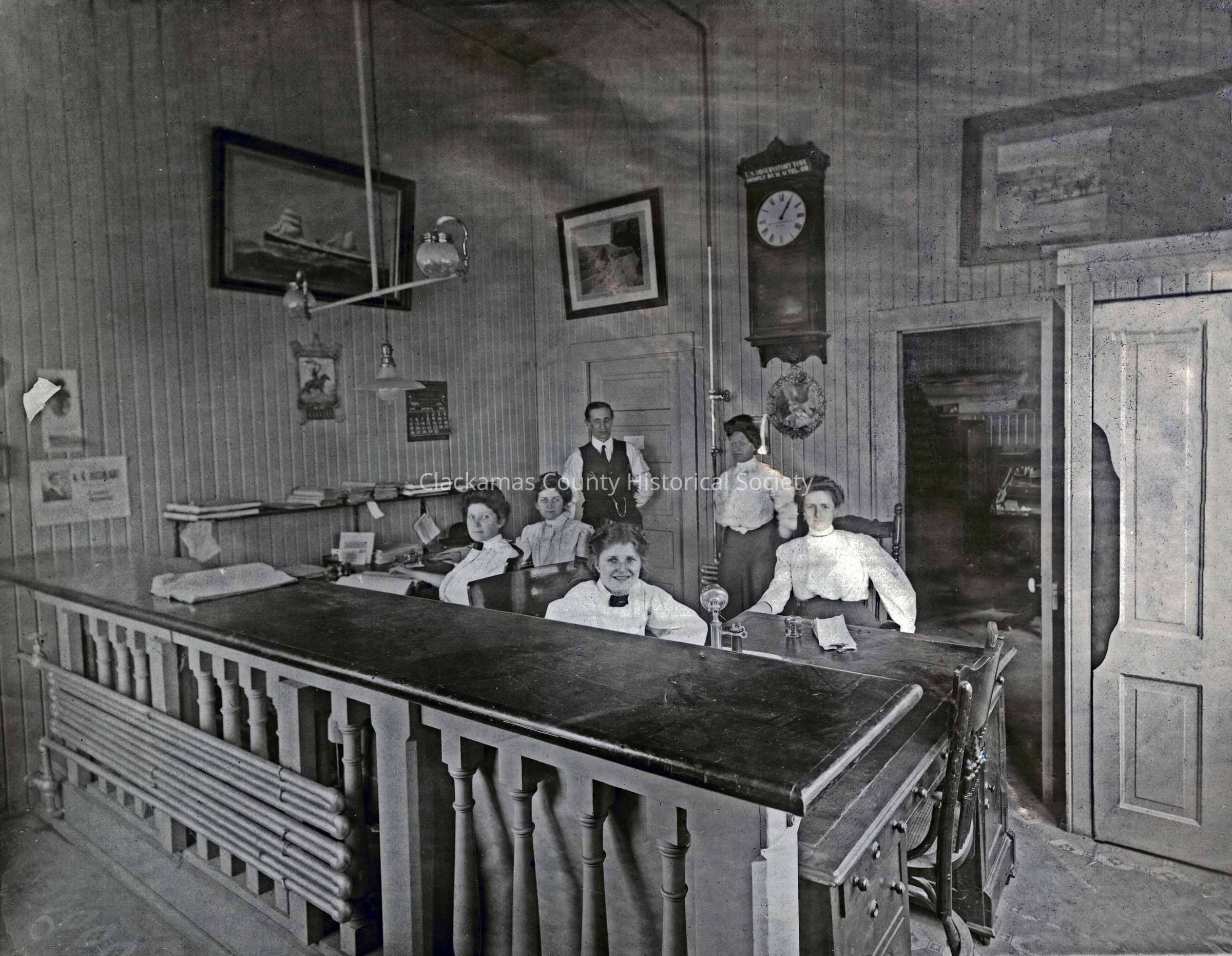 Interior of an office with 5 women and one man. Clock and pictures on wall. 1900?.Made/Created