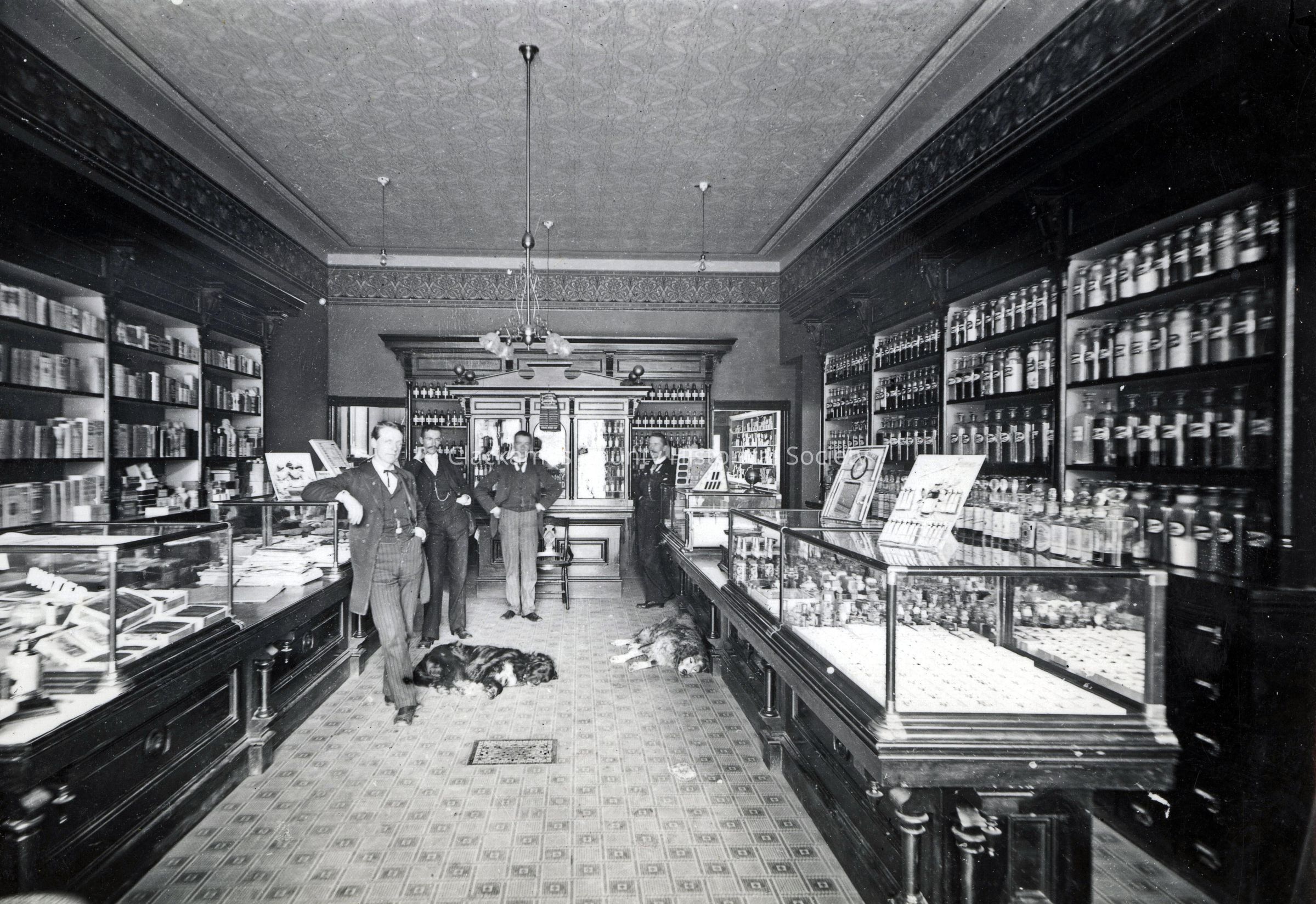 Caufield Drug Store. 8th and Main Street, 1886. 4 men and two dogs in interior of drug store. 6 copies.