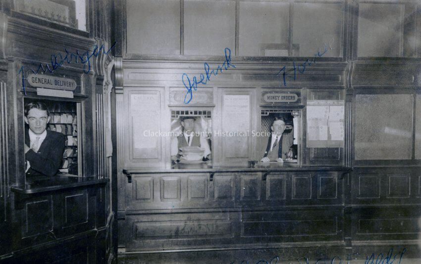Post office interior. Ray Trullinger behind General Delivery window; Bill Howell behind Money Order window; Carl Yamkee behind center window. 1908.Made/Created