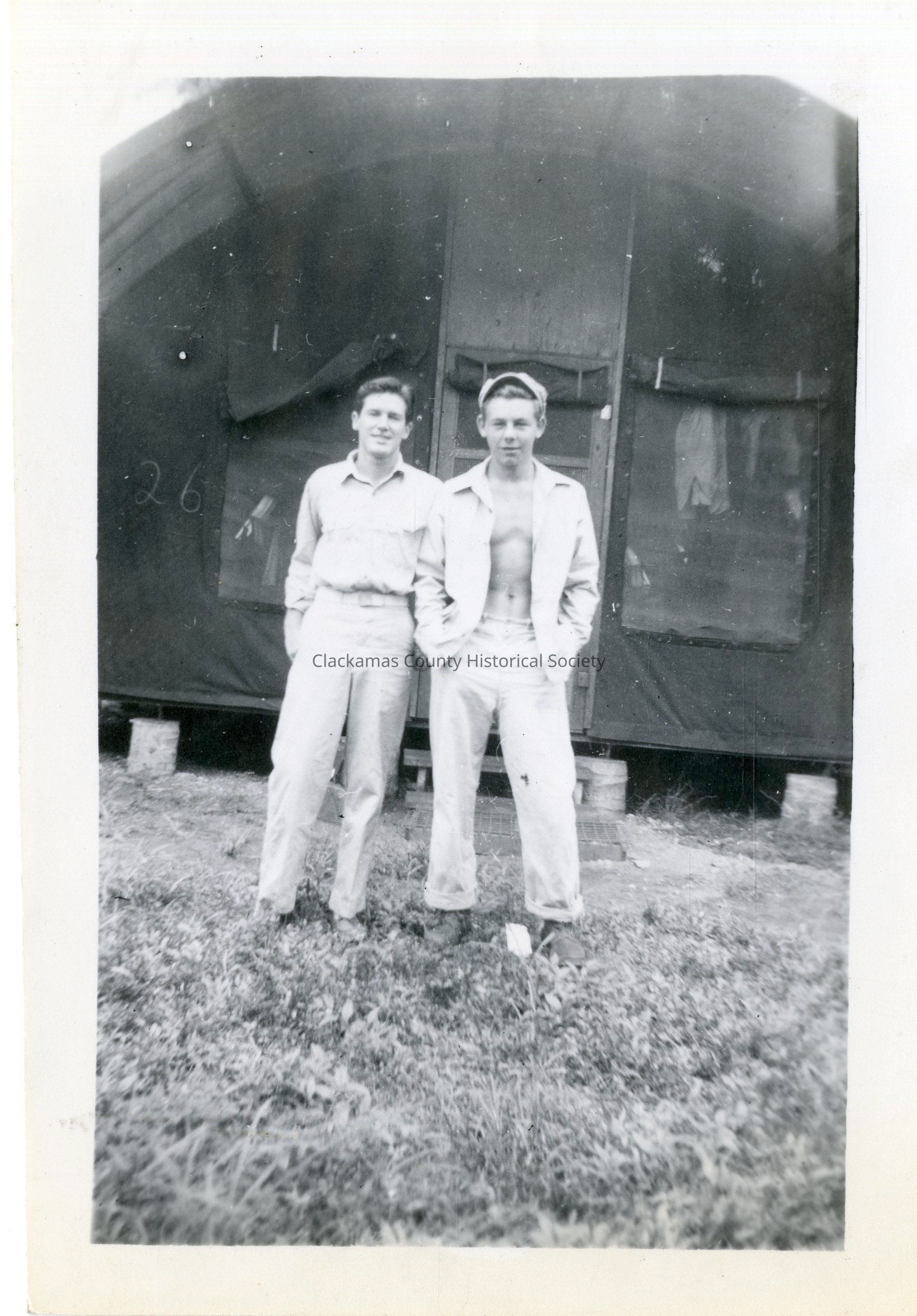 Clifford "Bud" Bassett (l) and unidentified friend standing in front of a Quonset hut in Guadalcanal during WWIIOther Names and Numbers