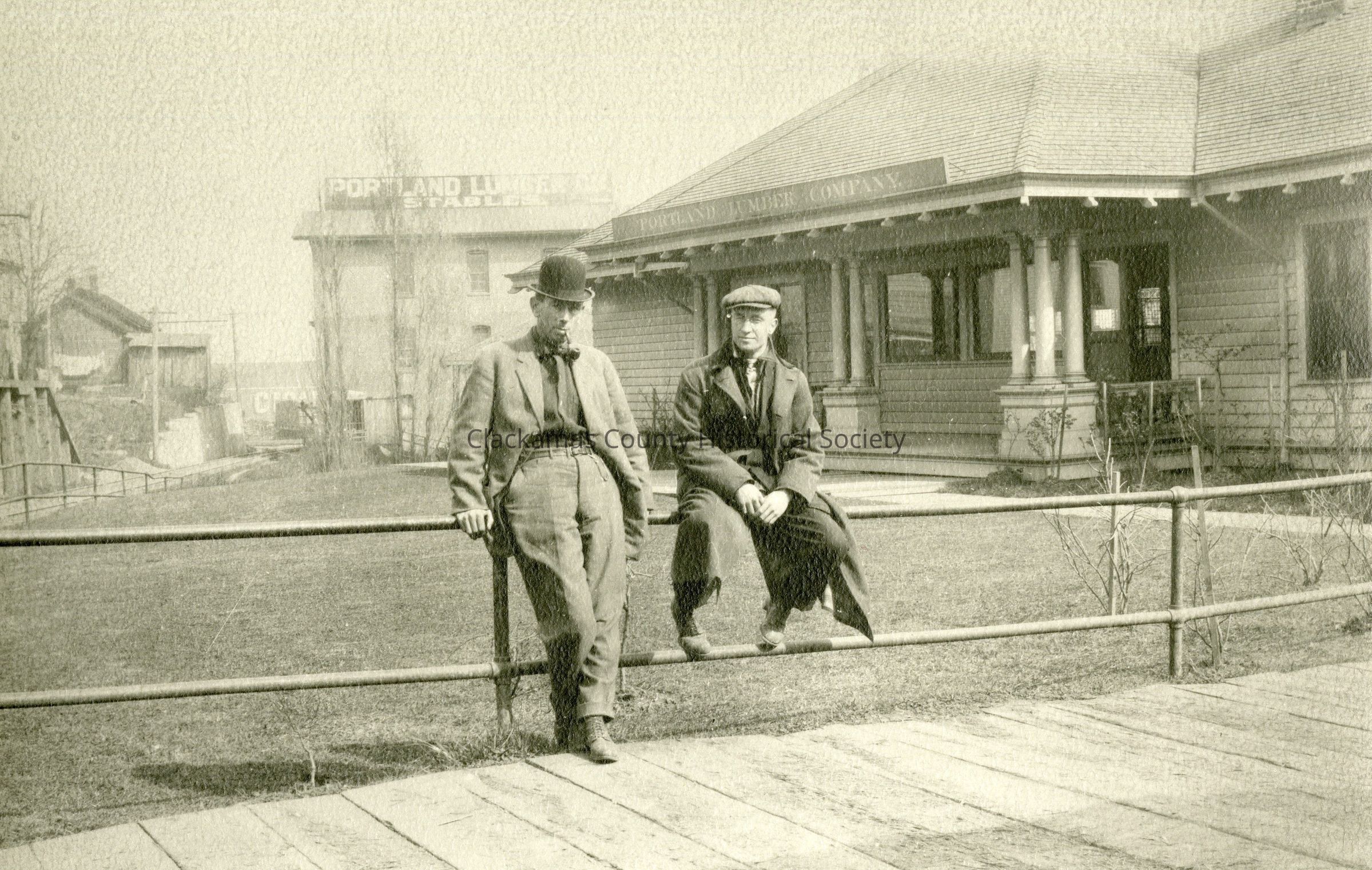 Unknown Men Sitting on a Railing in Front of Portland Lumber Company